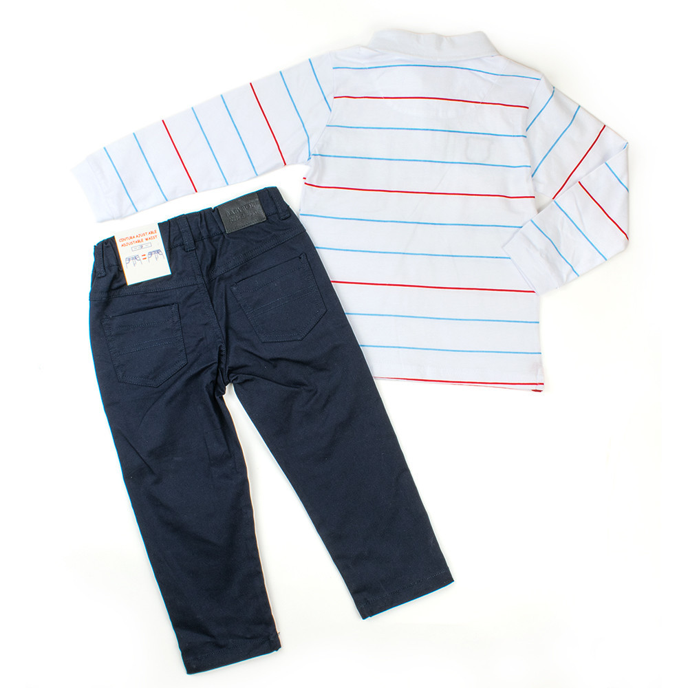 Стильный комплект Babybol состоящий из реглана поло и брюк понравится Вашему ребенку. Полосатый трикотажный реглан поло декорирован однотонным воротником и отворотами на рукавах выполненными трикотажной резинкой, накладным карманом, по бокам есть небольшие разрезы, застегивается спереди на пуговицы. Перед реглана украшает печатный принт. Однотонные брюки всегда нужны в гардеробе. Объем талии регулируется вшитой в поясе резинкой, которая затягивается застегивается на внутренние пуговицы.