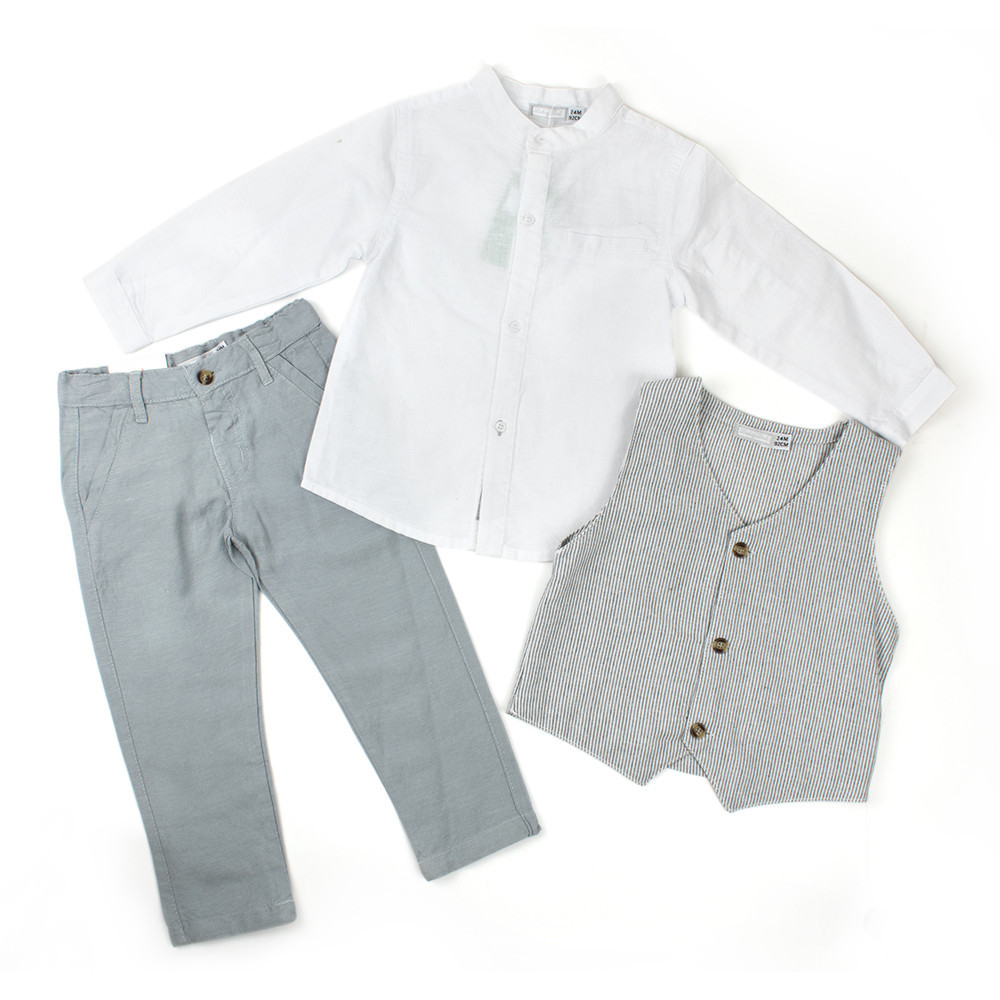 Стильный комплект тройка Babybol для мальчика состоящий из рубашки, жилетки и брюк понравится Вашему ребенку. Однотонная рубашка с воротом апаш декорирована карманом обманкой в рамке, застегивается на пуговицы по центру. Классическая жилетка в тонкую полоску застегивается спереди на пуговицы. Однотонные брюки всегда необходимы в гардеробе Вашего ребенка. Модные и стильные зауженные снизу, имеют два прорезных кармана спереди и один в рамке сзади. Объем талии регулируется вшитой в поясе резинкой, которая затягивается, и застегивается на внутренние пуговицы.