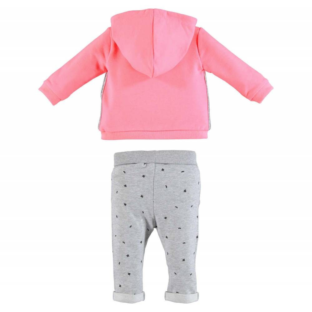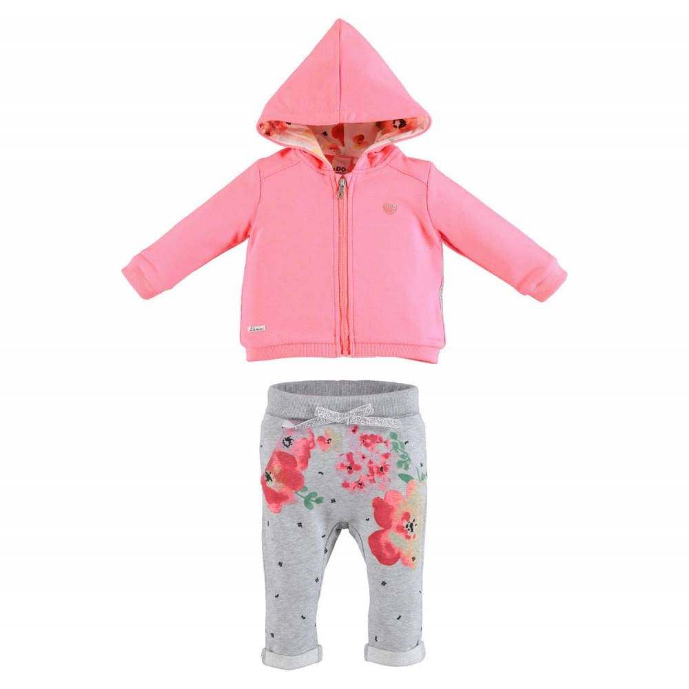 Красочный трикотажный хлопковый комплект предлагает для девочек iDO. Розовый свитер на молнии с капюшоном. Капюшон с контрастной подкладкой и цветочным рисунком. Серые штаны в горох продолжают цветочную тему. На поясе штанишек бант из люрексовой ленты, небольшие отвороты на лодыжке мягкие и эластичные.