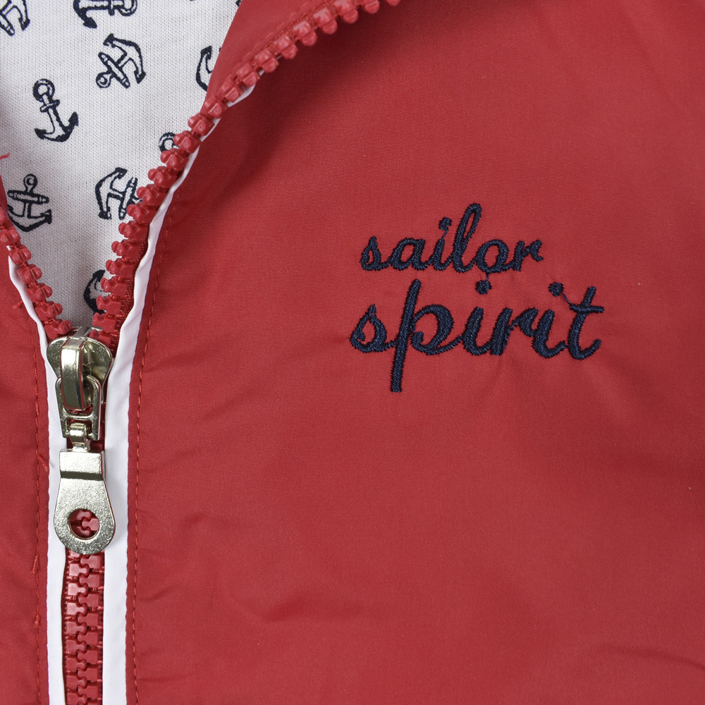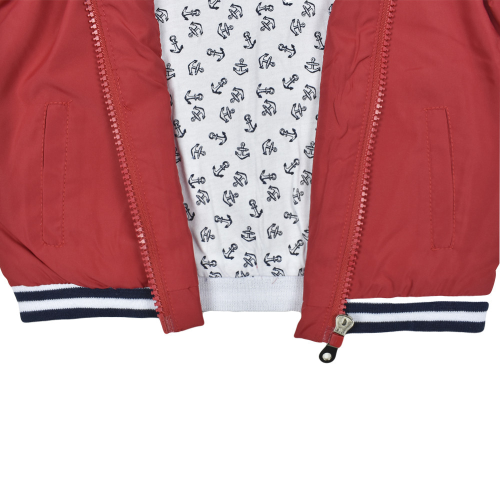 Куртка модель ветровка Babybol необходимая вещь в гардеробе Вашего ребенка. Ветровка однотонная, с контрастным внутренним воротником и манжетами из полосатой эластичной двойной трикотажной резинки. Трикотажная подкладка на морскую тематику, по всему полю - якоря. Перед декорирован контрастной вышивкой и карманами в рамке. Куртка застегивается на молнию.