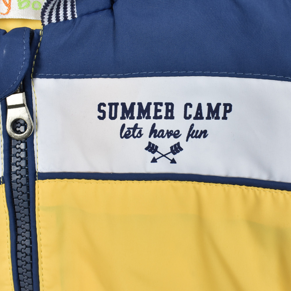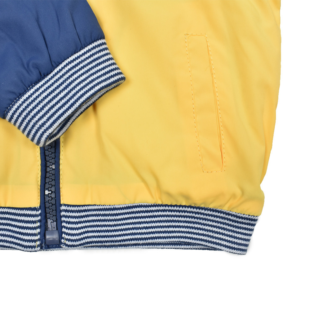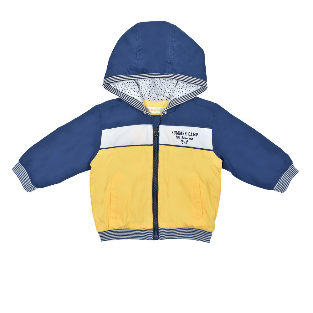 Ветровка с капюшоном Babybol необходимая вещь в гардеробе Вашего ребенка. Ветровка цветная - плечи, капюшон и рукава темно-синие низ желтый. Трикотажная двойная эластичная резинка на поясе талии, манжетах рукавов и вокруг капюшона. Трикотажная хлопковая подкладка с принтом по всему полю. Перед декорирован контрастным печатным принтом и карманами в рамке. Куртка застегивается на молнию.