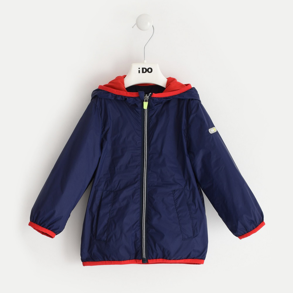 Демисезонная спортивная куртка ветровка с капюшоном iDO для Вашего ребенка пошита из нейлона. Ветровка на тонкой трикотажной подкладке с эмблемой на рукаве. Подкладка капюшона контрастного цвета. Низ и рукава прошиты эластичным контрастным шнуром.
