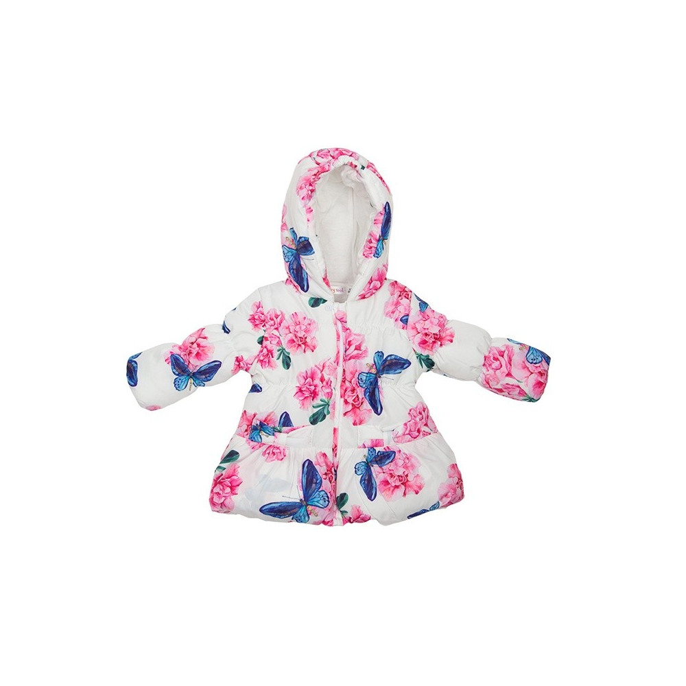 Демисезонная куртка Babybol для девочки с расцветкой в бабочки и цветы не оставит равнодушной Вашу девчушку. Куртка стеганная, с капюшоном, слегка расклешонная к низу за счет оборки.