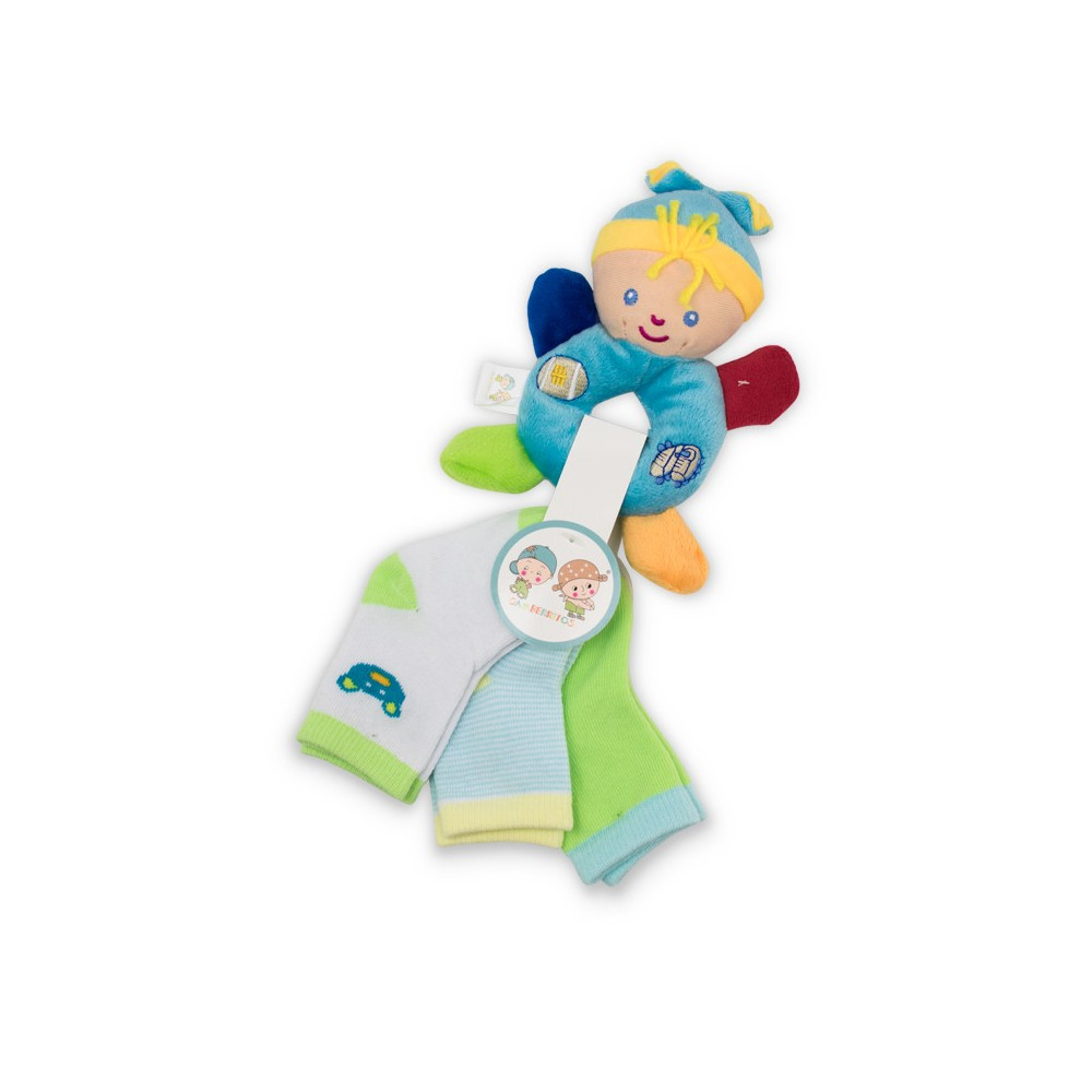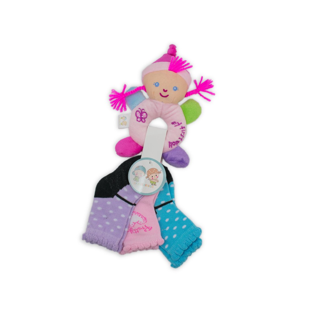 Замечательная идея для подарка 2 в 1. Погремушка порадует ребенка, а маму еще и набор из трех пар носков. Носочки с жаккардовым узором и все с разными рисунками.