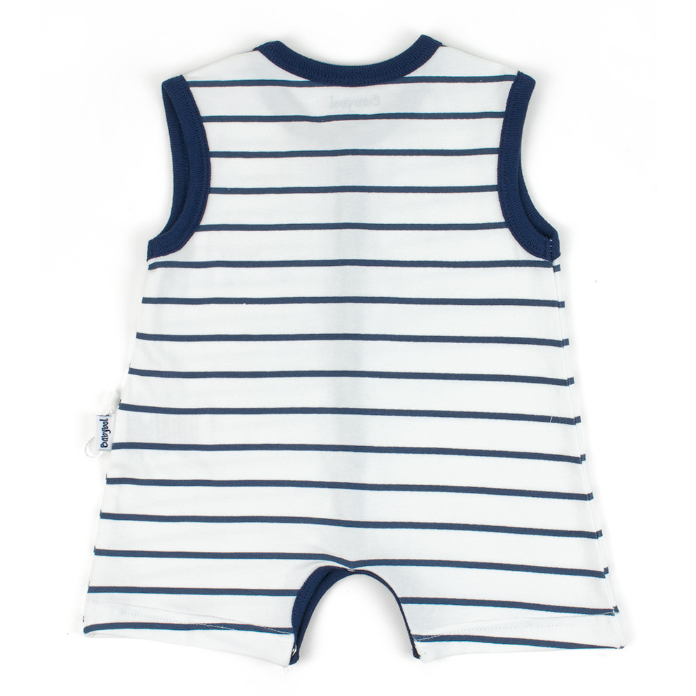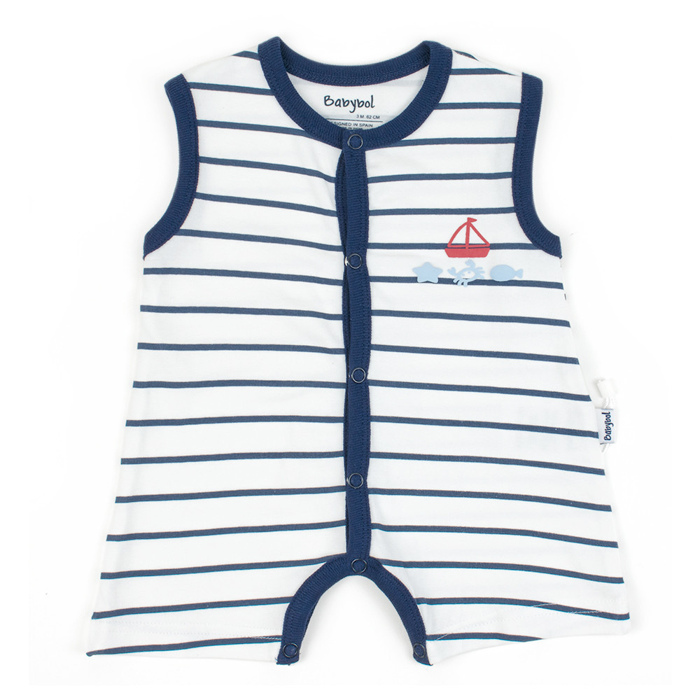 Очень удобная одёжка для жаркого летнего дня - мягкий песочник для мальчика Babybol из натурального, дышащего хлопка. Полосатый песочник без рукавов декорирован по центру переда детским рисунком на морскую тематику. Горловина, пройма, полочка спереди обработаны контрастной трикотажной резинкой. Застегивается спереди на кнопки, есть кнопки между ножками для удобства смены подгузника. Свободный песочник не стесняет движений ребёнка, в нём не жарко и удобно. Отличный выбор для прогулок, для песочницы, пляжа.