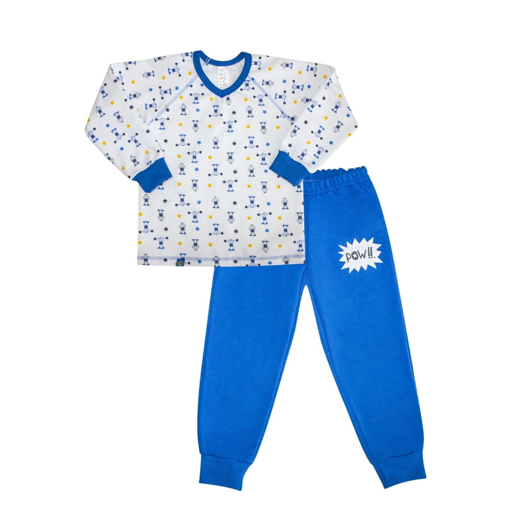 Теплая и уютная детская пижама из футера с начесом с длинными рукавами и округлым вырезом горловины. Пижама свободного кроя и не будет стеснять движения, брюки снизу на манжете, что не позволит задираться штанине во время сна. Пижама декорирована печатным рисунком и нашивками.