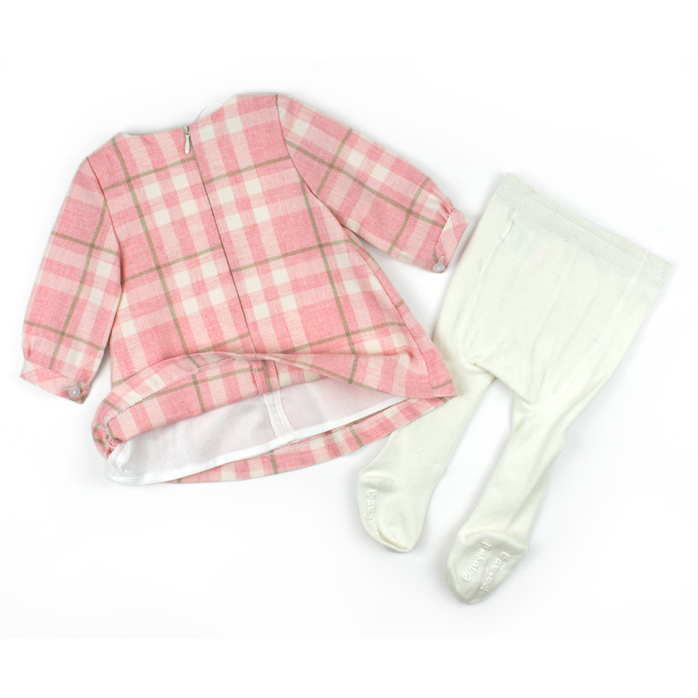 Прекрасный комплект Babybol для девочки состоит из платья и колгот. Клетчатое платье с длинным рукавом на подкладке выполнено из 100% хлопка, застегивается на спинке скрытой молнией. Спереди платье с встречной складкой украшенной бантом. У однотонных белых колгот носочек и пяточка розовые, как основной тон платья.