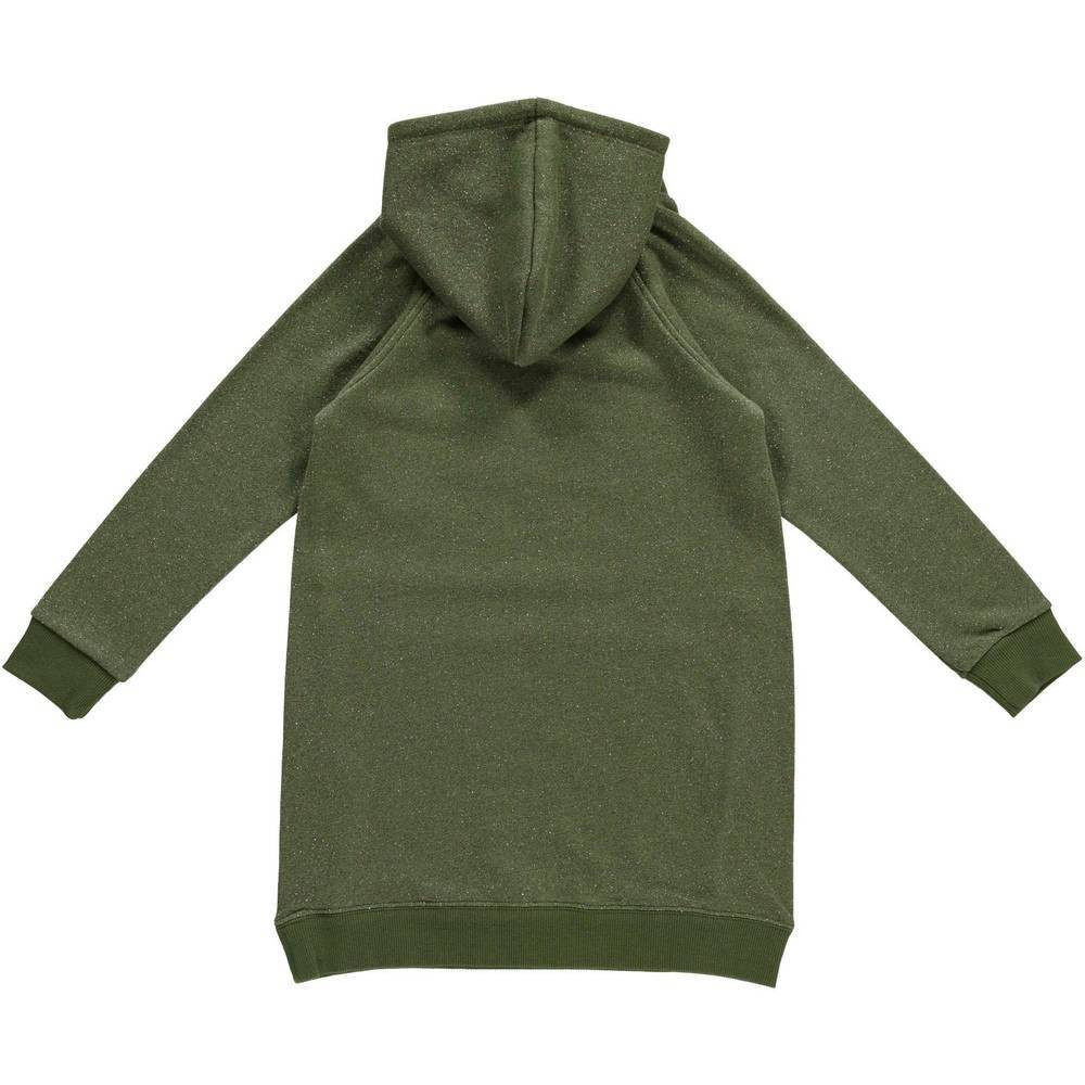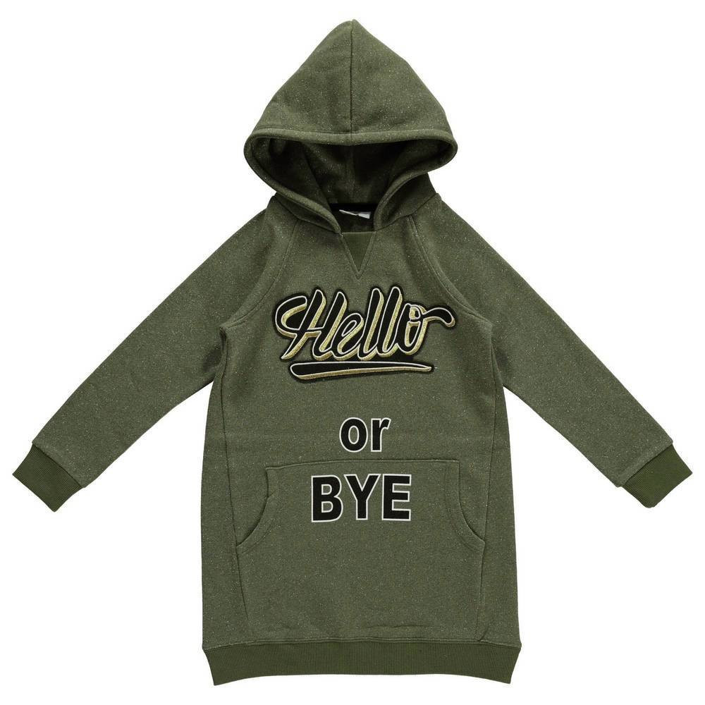В гардеробе каждой девочки должны быть платья. Такое стильное платье с капюшоном в стиле casual просто создано, чтобы подчеркнуть яркий характер Вашей девочки и подарить ей комфорт в каждом движении. Изготовленное из смеси хлопковой ткани с металлизированной нитью. Свободный фасон платья не просто выглядит стильно, но еще и будет очень удобным для активной девочки. Спереди платье украшено яркой аппликацией и карманом кенгуру.