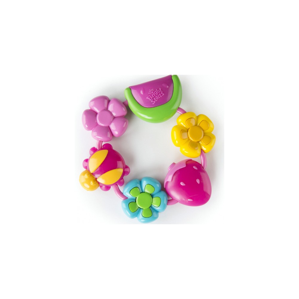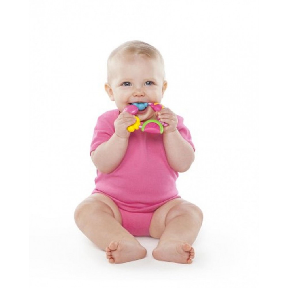 Яркий необычный прорезыватель Летний день напоминает цветочную полянку, где растут на кольце 3 цветочка, ягодка, арбузик и сидит жучок. Игрушка помогает облегчить боль в то время, когда режутся зубки. Ребёнку удобно держать кольцо.