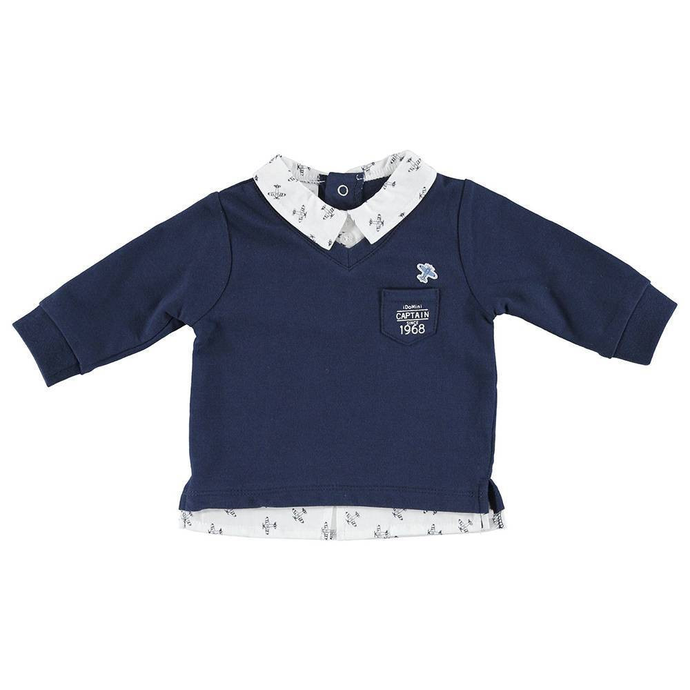 Этот реглан поло іDO изготовленный из 100% хлопка-трикотажа с вставкой из рубашки обманки, застегивается сзади на кнопки. Трикотажный реглан с V образным вырезом оригинальное и очаровательным решение. Картинка самолетика над карманом украшает реглан.
