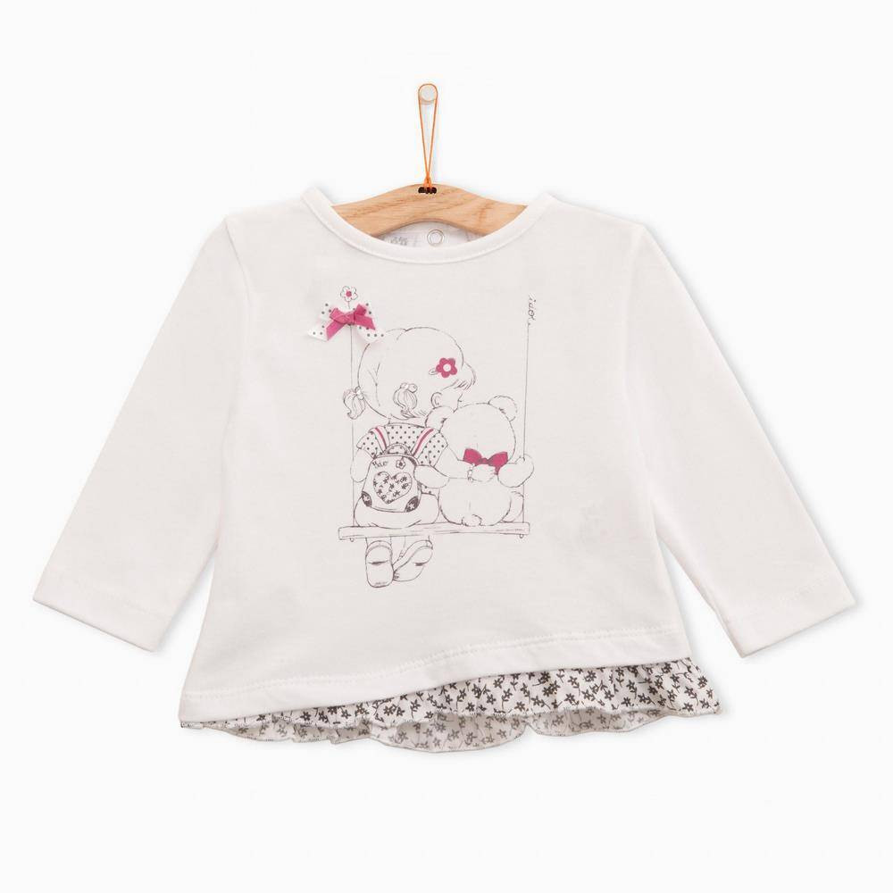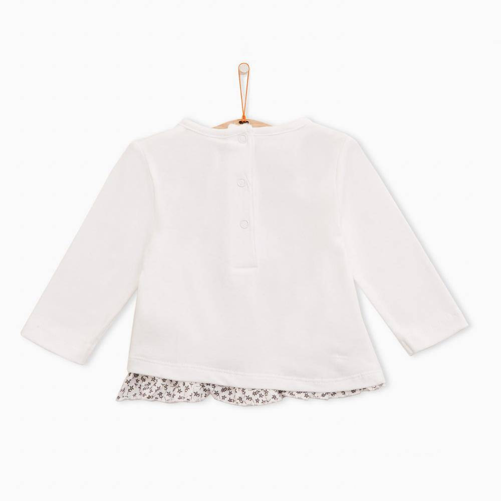 Красивый и стильный свитер создан, чтобы подарить Вашей малышке комфорт в каждом движении. В таком свитере нежного белого цвета с невероятно симпатичной аппликацией Ваша малышка всегда будет в центре внимания. В основе свитера - натуральная хлопковая ткань (100%), а это значит, что малышке будет в ней комфортно даже во время очень активных игр. Свитер удобно застегивается сзади на пуговки. Главный акцент этой свитера - это модный ассиметричный низ, декорированный оборкой с цветочным принтом.