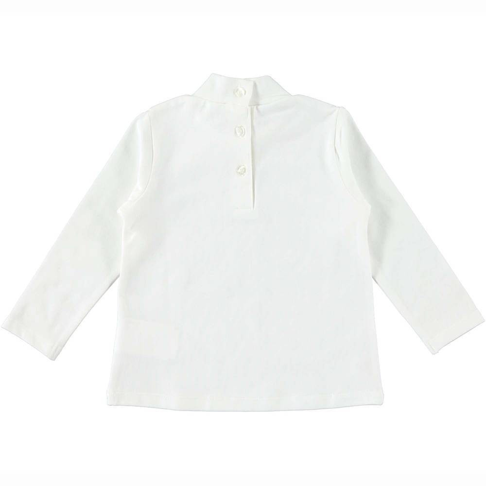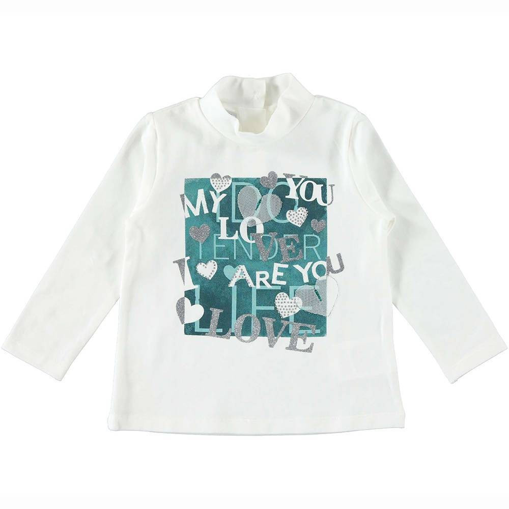 Трикотажный хлопковый свитер IDO прекрасное дополнение в гардеробе для Вашей девочки. Свитер с воротником стойкой, спереди украшен печатным принтом сердечками со стразами. Застежка на спинке - перламутровые пуговицы. Все очень просто и стильно.