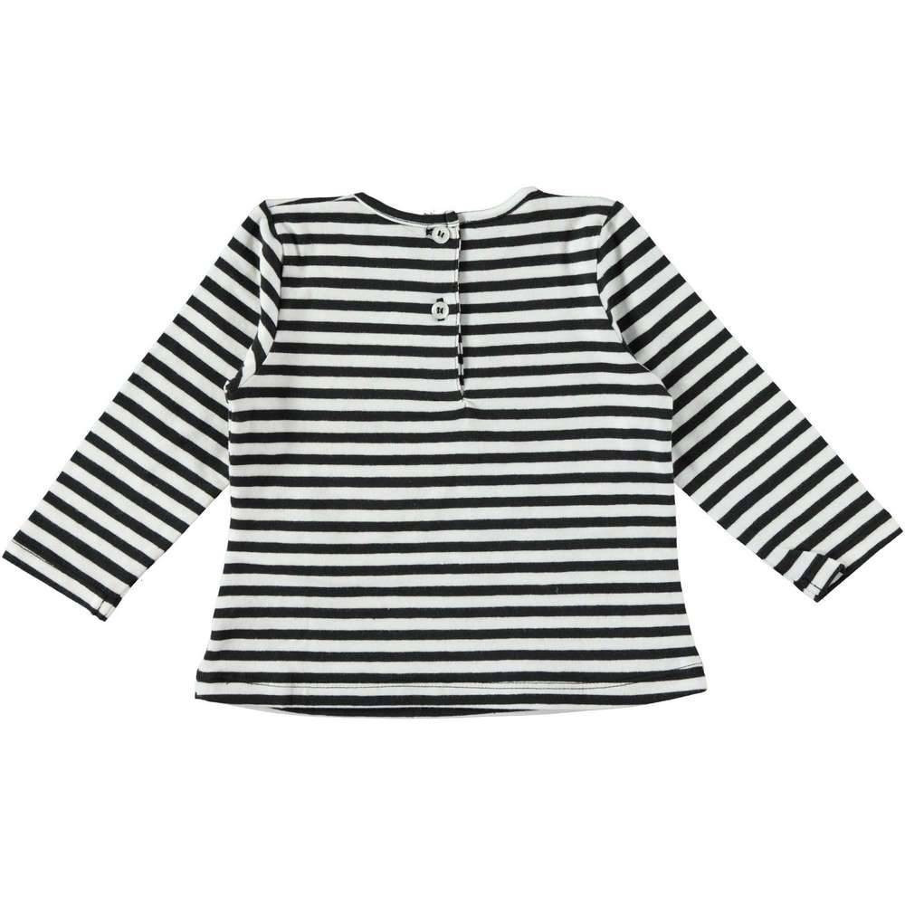 Трикотажный хлопковый в полоску свитер IDO прекрасное дополнение в гардеробе для Вашей девочки. Свитер спереди украшен печатным принтом и аппликацией в виде розы и бабочки. Застежка на спинке - перламутровые пуговицы. Все очень просто и стильно.