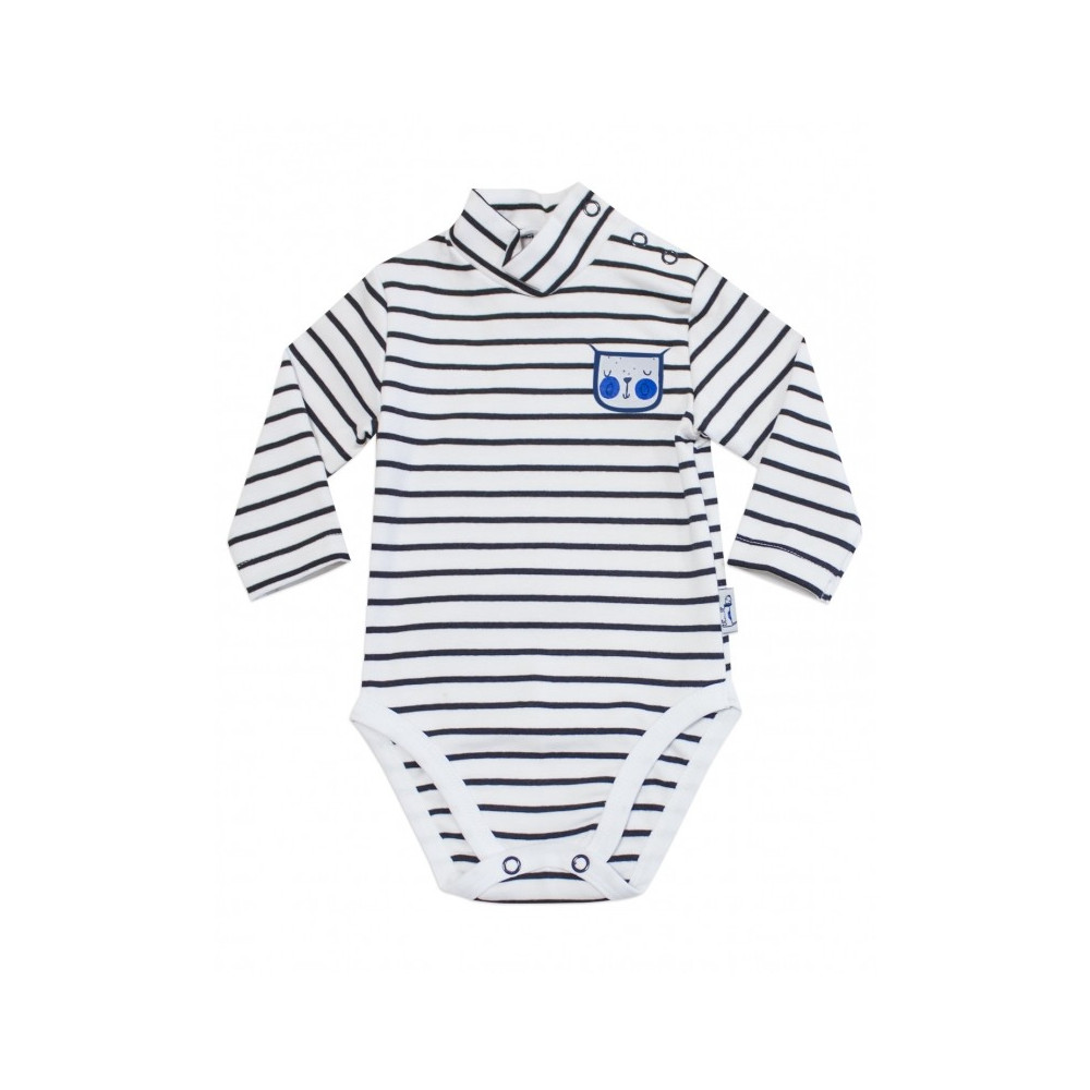 Боди-гольф с длинным рукавом изготовлен из эластичного хлопкового трикотажного стрейч ластика. Для удобства переодевания застежка - кнопки, выполнена на плече и между ножками. Эластичный материал хорошо облегает фигуру малыша и не стесняет его движений. Модель декорирована печатным принтом.