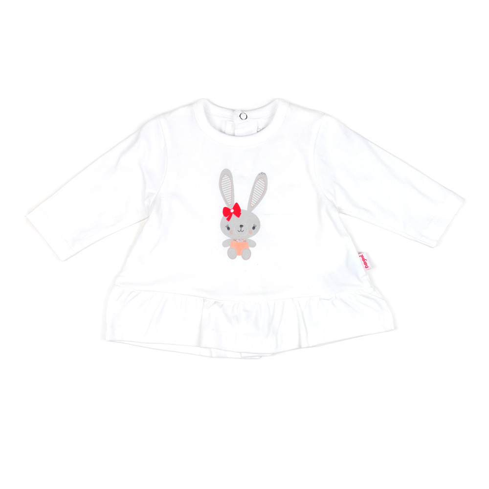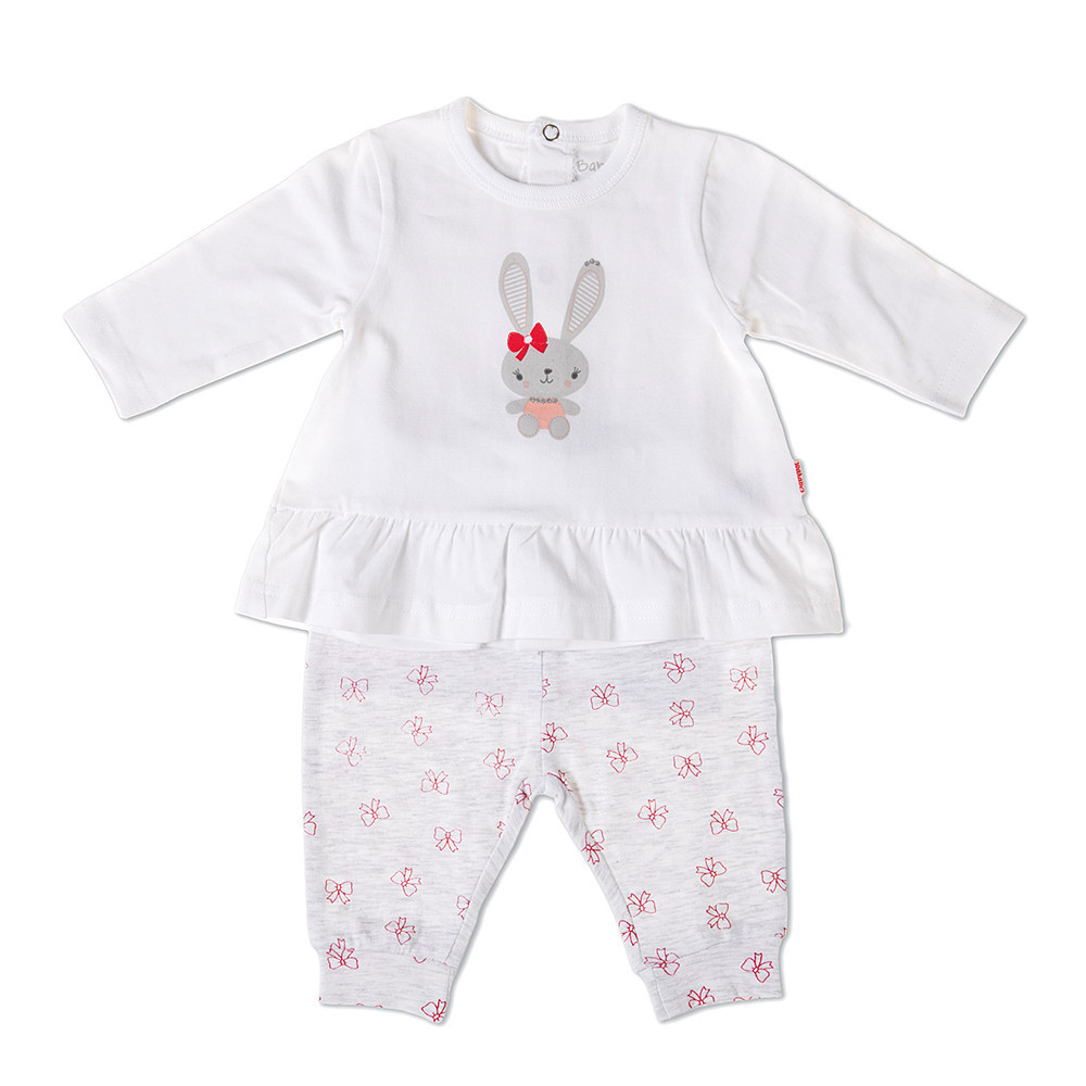 Замечательный трикотажный комплект Babybol для новорождённой девочки состоит из реглана и штанов. Реглан декорирован оборкой и спереди украшен детским веселым рисунком. Застежка реглана расположена на спинке - кнопки. Штаны с цветным принтом в виде бантиков по всему полю, на талии в поясе вшита резинка, на лодыжке манжеты.