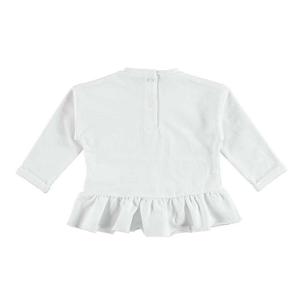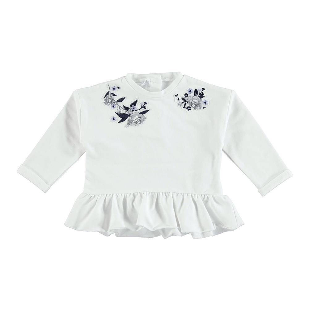Универсальная и удобная туника расклешенная к низу из хлопчатобумажной ткани с пышной оборкой по всей длине. Спереди на плечах украшена цветочными аппликациями. застегивается на спине на 2 перламутровые пуговицы. Очень элегантная универсальная одежда iDO не оставит равнодушной маленькую модницу.