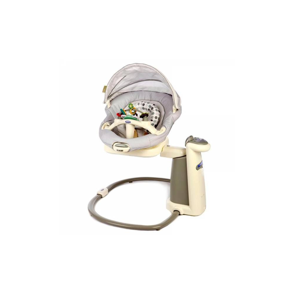 Электрокачели Graco Sweetpeace станут "няней" для малыша весом до 9 кг (начинать использовать качели можно с первых дней жизни ребенка). Качели могут двигаться в трех разных направлениях, имеется 6 скоростей движения, а также таймер. Graco Sweetpeace оборудованы музыкальным модулем, в памяти которого 15 мелодий и звуков природы, кроме того, есть возможность подключить MP3-плеер. Съемное сиденье предусматривает 4 варианта положения спинки, сиденье можно использовать и как отдельную колыбель. На козырьке над сиденьем подвешены игрушки: зеркальце, прорезыватель для зубов и плюшевый зверек. Качели могут работать как от батареек, так и от сети. Чехол сиденья съемный, легко поддается стирке.