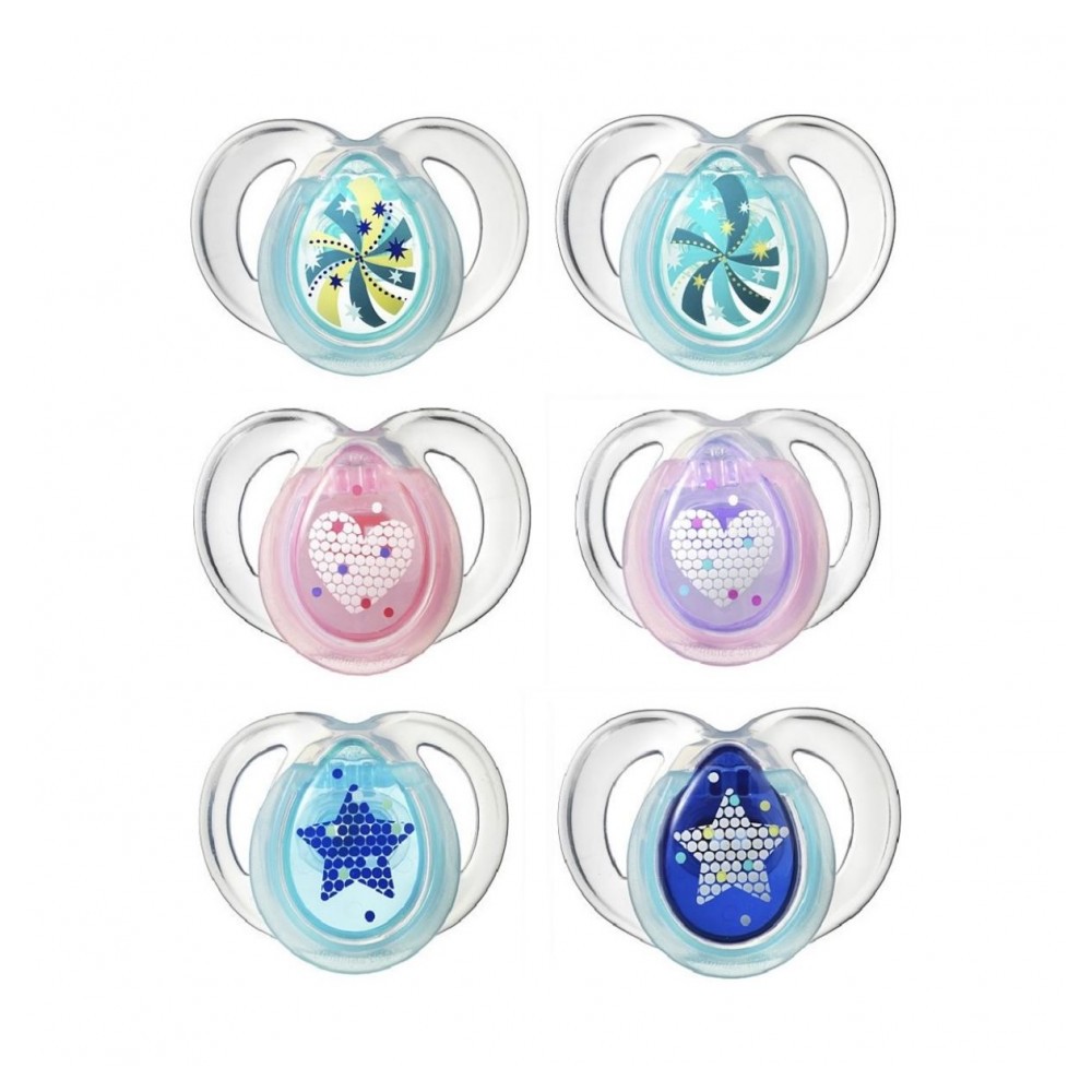 На нагубнике выполнен тематический «ночной» рисунок, чтобы Вы могли легко найти соску со светящейся полоской. Изготовленная из силикона пустышка безопасна для малышей, в состав не входит Бисфенол А, который используют в качестве отвердителя при производстве продуктов из пластика и производных продуктов. В набор входят две ночные соски с разным рисунком, но обе со светящейся каймой.