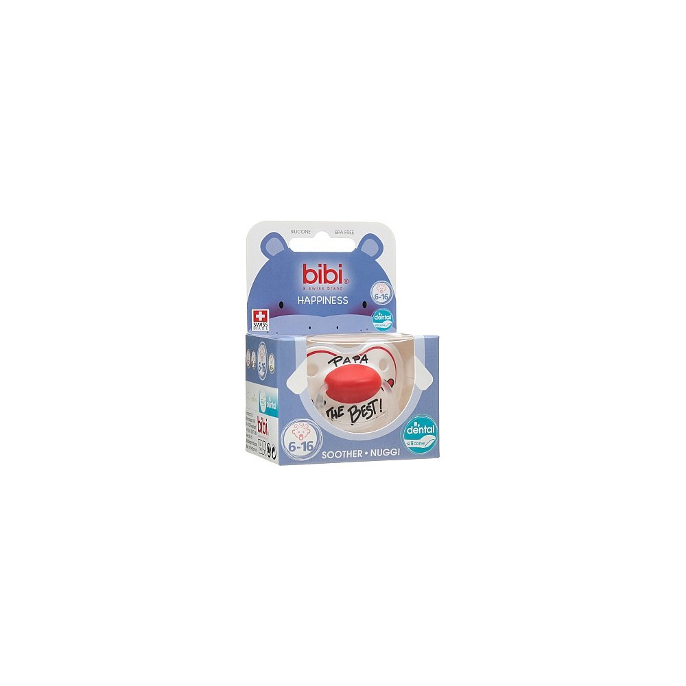 Пустышка Bibi Happiness Dental — это швейцарское качество и безопасность Вашего ребенка. Пустышка подходит как для мальчика, так и для девочки, ведь какой у них замечательный дизайн! Надпись на пустышке "Мой папа лучший" несомненно вызвет улыбку у взрослых, а яркий рисунок сделает пустышку любимой вещью Вашего малыша.