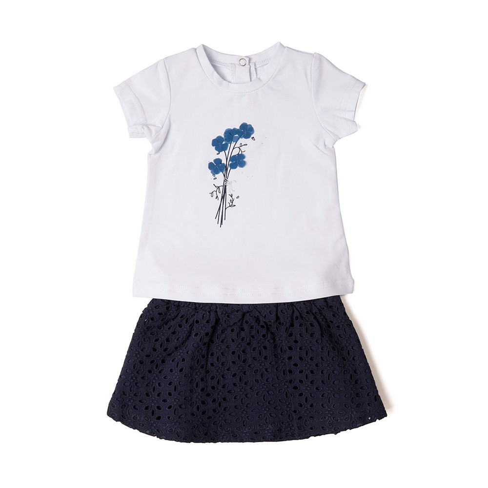 Замечательный летний комплект предлагает Babybol юным леди - футболка и юбка. Белая однотонная футболка спереди декорирована цветочным принтом и аппликацией. Застежка на спинке кнопки только для размеров до 3 лет, что значительно упростит и ускорит процесс одевания. Пышная, свободная кружевная юбка на подкладке на эластичном поясе, что позволит регулировать объем талии. Украшением служит бант по центру.