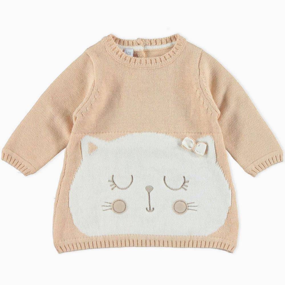 Очаровательное вязанное платье с длинными рукавами iDO предлагает нашим девочкам. Платье расклешено к низу. Спереди связана чудная мордашка белого котенка с пришитым бантиком. Застежка на спинке - пуговицы. Длина до средины колена.