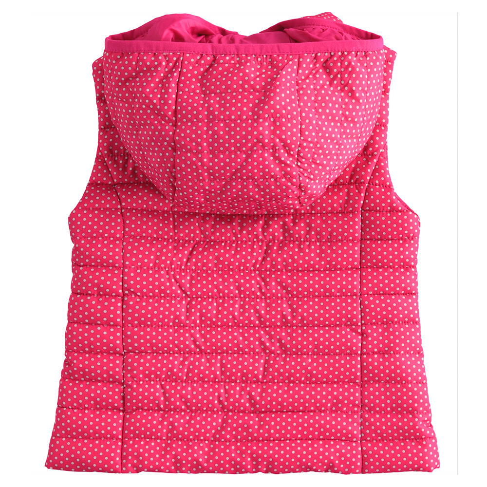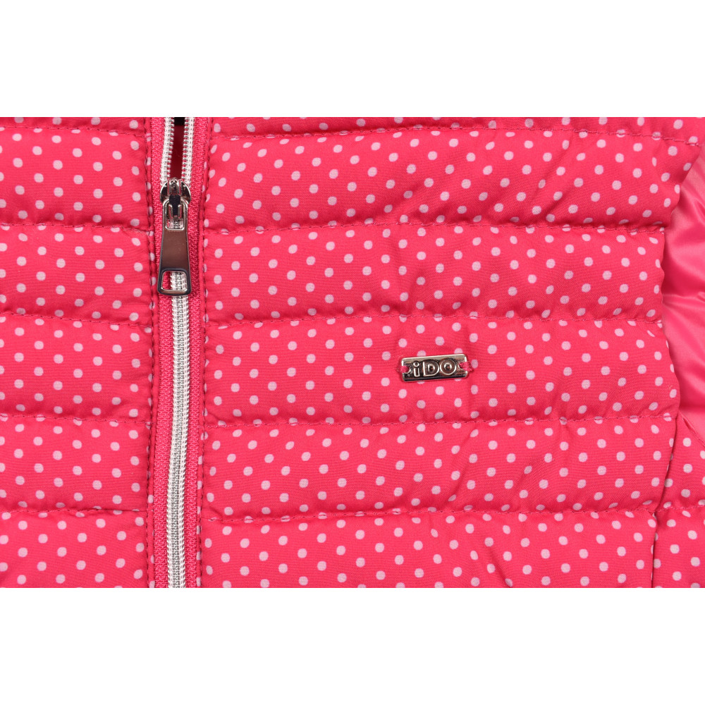 Нейлоновый жилет с капюшоном iDO предлагает девочкам для предстоящего сезона. Модель с принтом в горохи, со стегаными горизонтальными полосами, с боковыми карманами на потайной молнии, застегивается на молнию. Очень хороший, практичный предмет одежды.