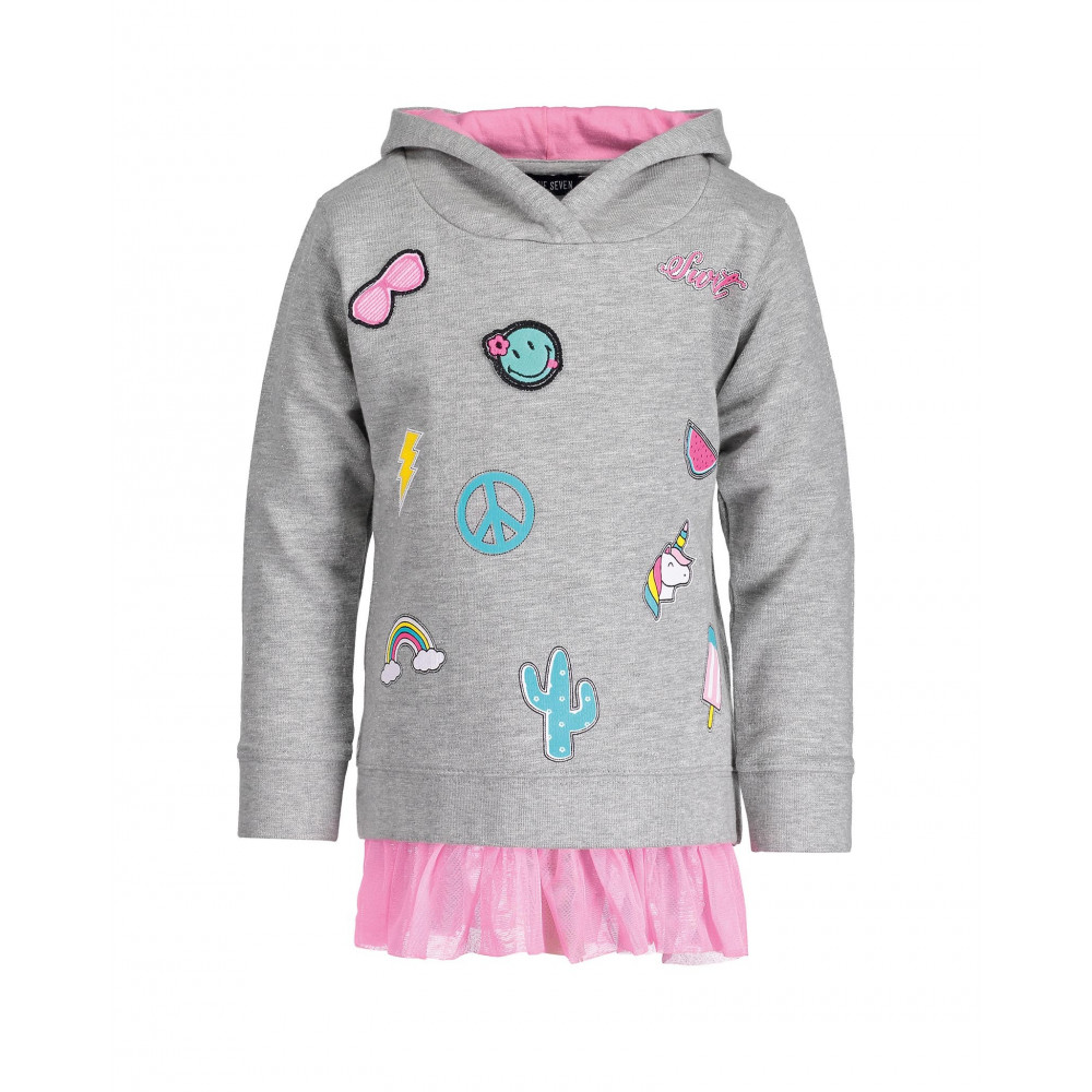 Стильний трикотажний светр з каптуром необхідний в гардеробі дівчинки. Прикрашає светр принт спереду, рюш знизу рожевого кольору, підкладка каптура теж рожева. Розмір виробу визначається зростанням Вашої дитини.