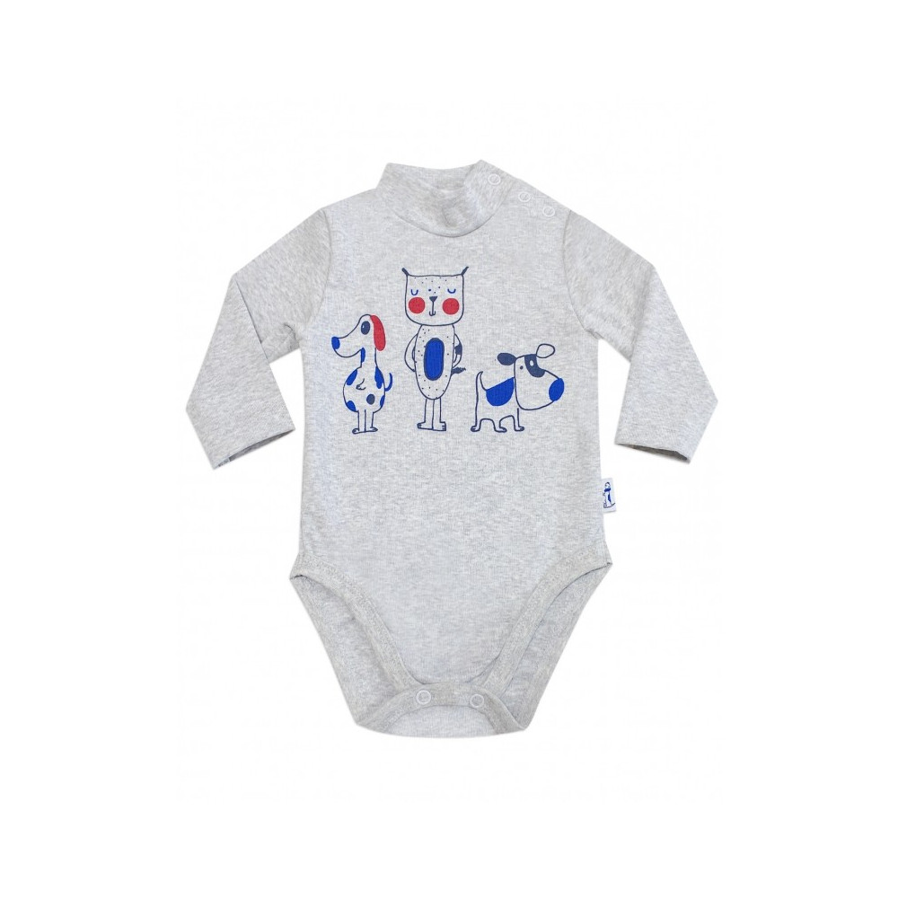 Боді з коміром стійкою з довгим рукавом виготовлений з еластичного бавовняного трикотажного полотна. Для зручності перевдягання застібка – кнопки, виконана на плечі та між ніжками. Еластичний матеріал добре облягає тіло малюка і не обмежує його рухів. Модель декорована друкарським собачим принтом.