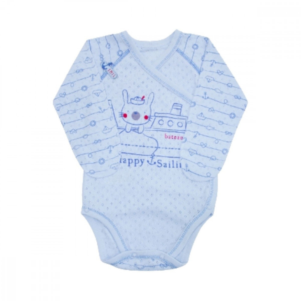 Трикотажний боді для новонароджених з довгим рукавом - це зручний легкий одяг, в якому малюкові буде комфортно навіть у найспекотніший літній день. Зшитий з натуральної тканини 100% бавовна (ажурна гумка), яка не викликає подразнення, не парить шкіру малюка. Застібається на боці та знизу на зручні кнопочки, шви назовні, на ручках подряпини, прикрашений боді милим принтом на морську тематику.