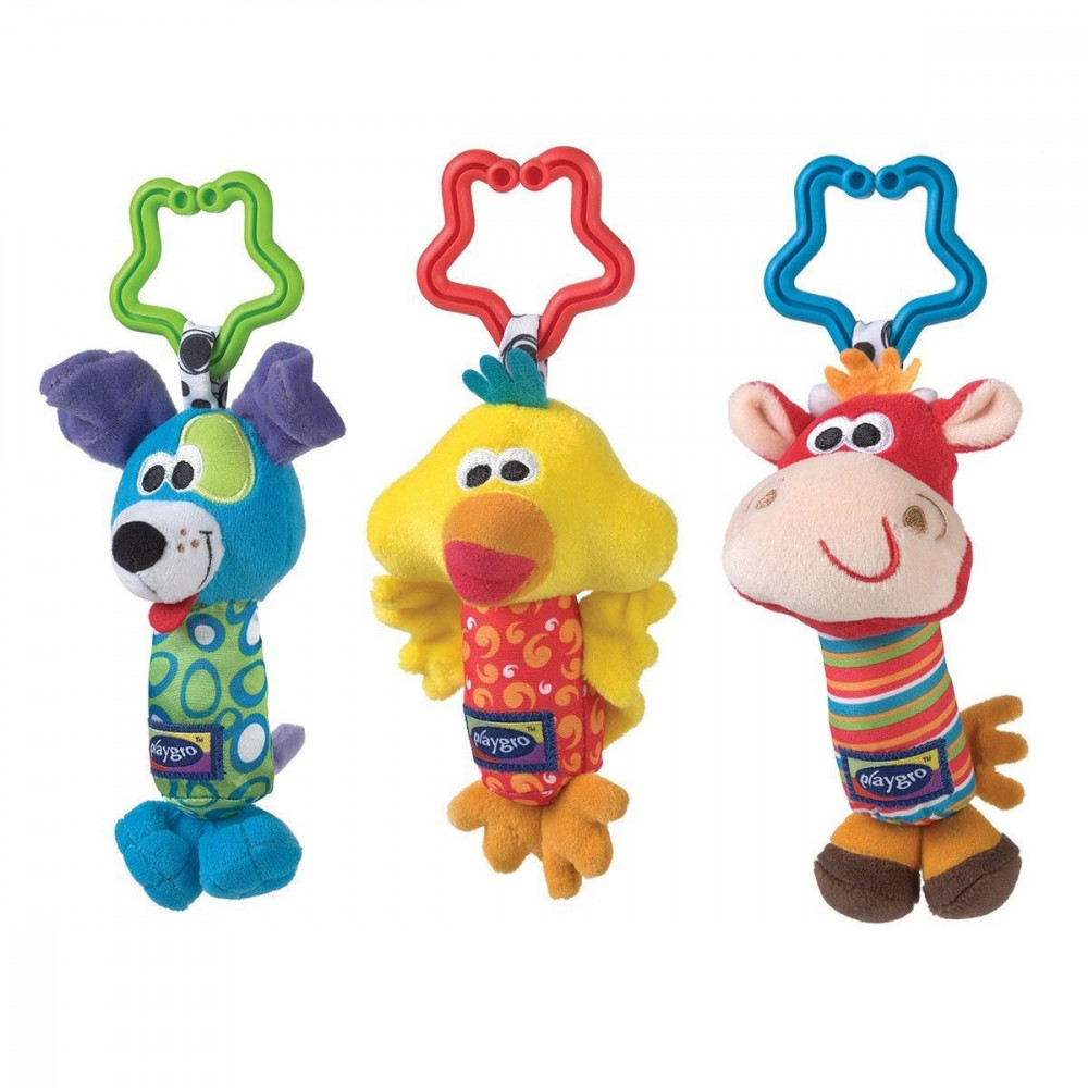 Пташка, корівка та маленька собачка, як і належить справжнім друзям, можуть поговорити з малюком. Вони видають кожна свій звук, з ними можна весело проводити час, поки мама везе на прогулянку. Брязкальця легко кріпляться до коляски.