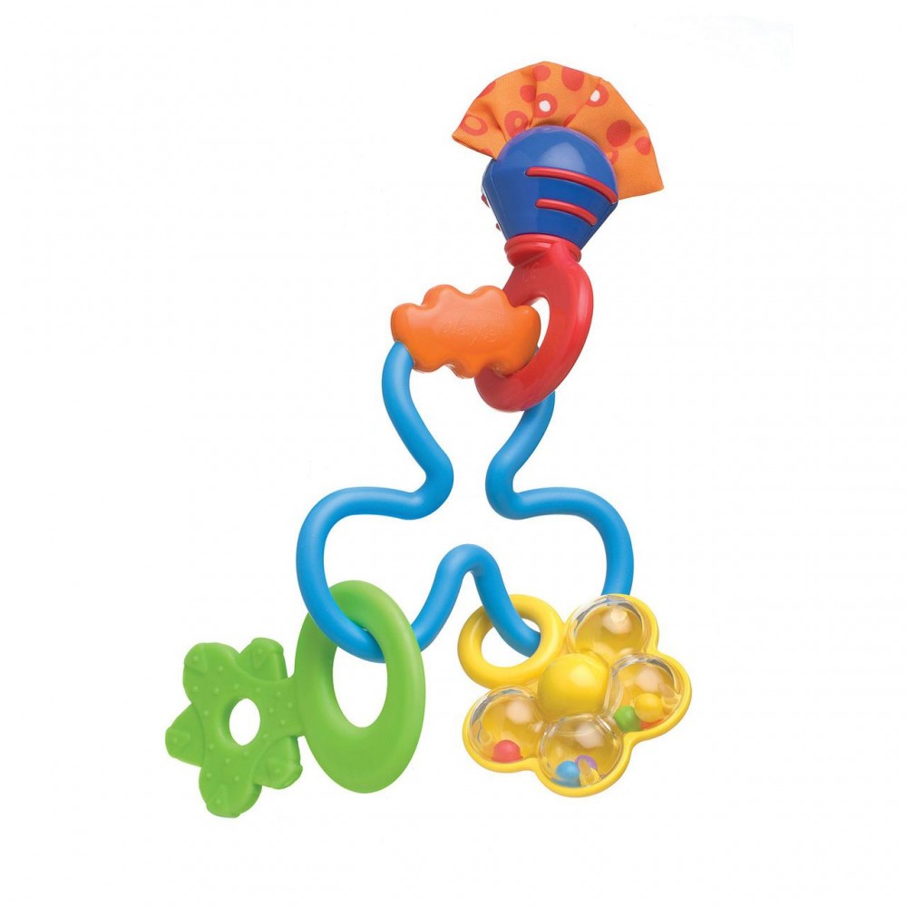 Пластикове брязкальце "Квіточка" (PlayGro, 7 164) здивує малюка барвистими весняними квітами і приємним звуком. Іграшки має прорізувач для зубів, може приймати цікаві форми і дзвенить завдяки кулькам. В процесі гри з квіточкою розвивається зір дитини, логічне мислення, тактильне сприйняття, вміння брати і управляти об'єктами.
