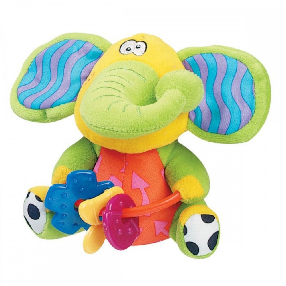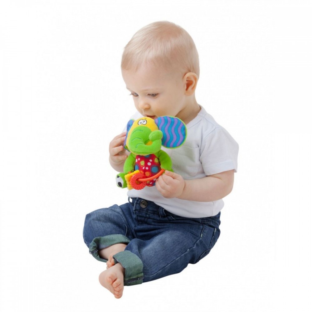 Брязкальце "Слоненя" виконана у вигляді м'якої фігурки з прорезивателей. Іграшка має безліч корисних деталей: вушка слона шарудять, на животику є брязкальце, цікавий хвостик. Наявність різних фактур і невеликий розмір зроблять брязкальце дійсно зручною для щоденної гри. Розвивається зір малюка, образне мислення, тактильне сприйняття і умовні рефлекси