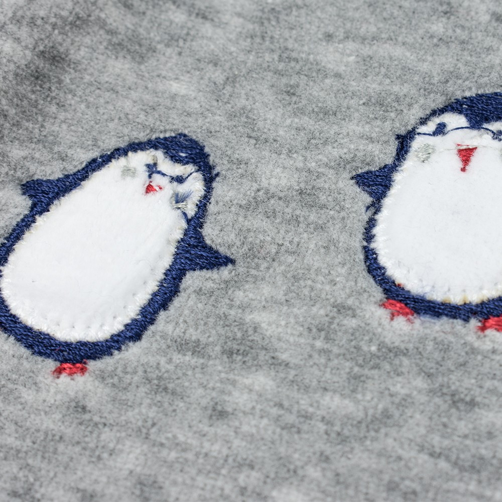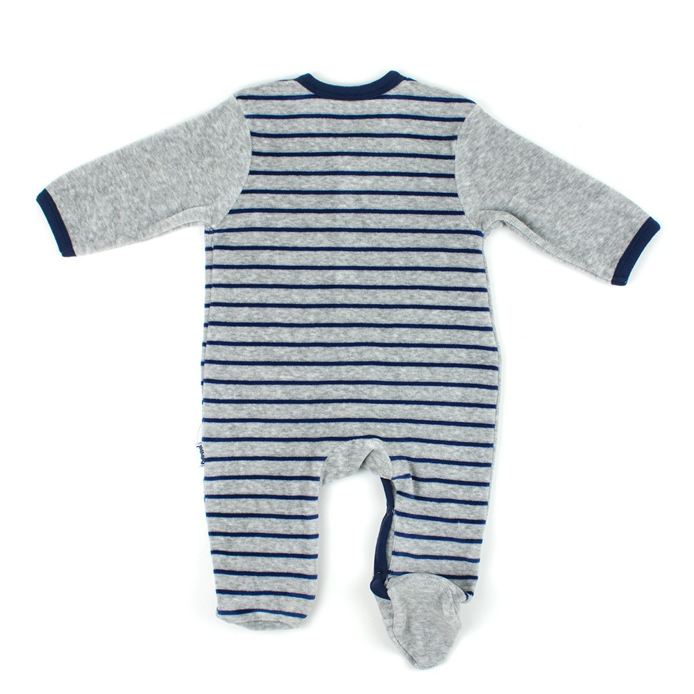 Трикотажний велюровий комбінезон-чоловічок Babybol для новонародженого хлопчика наполовину смугастий застібається спереду на кнопки по всій довжині, що суттєво полегшує та прискорює процес одягання, кнопки між ніжками – для зручності зміни підгузка. Горловина, низ рукава оброблені контрастною трикотажною бейкою для запобігання розтягування. Чоловічок прикрашає весела аплікація пінгвінів.