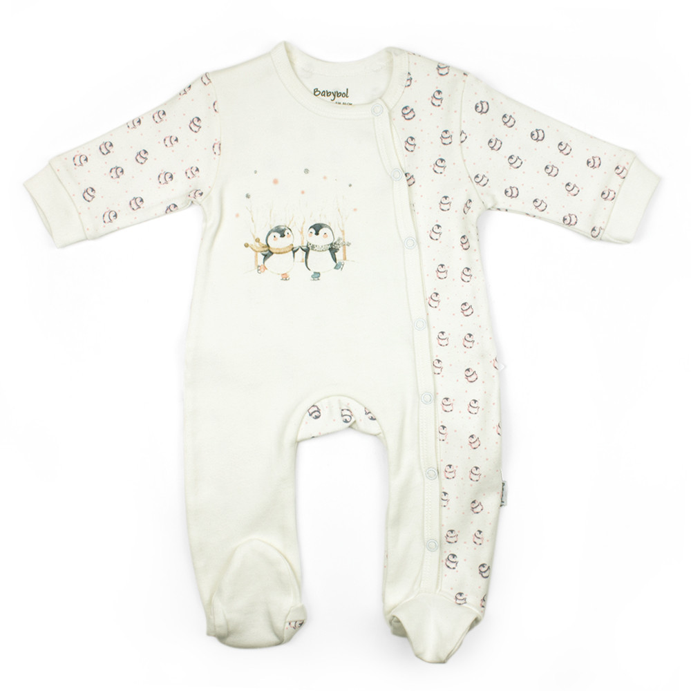 Трикотажний чоловічок Babybol виконаний зі 100% бавовни чудово підходить і для виписки, і для сну будинку Вашої новонародженої малечі. Половина переду чоловічку та спинка кольорові, друга частина однотонна. Манжети на рукавах та стопи – однотонні. Спереду на однотонній половинці є прикрасою милий дитячий зимовий малюнок. Людин застібається на кнопки спереду по всій довжині, що значно полегшує одягання малюка.