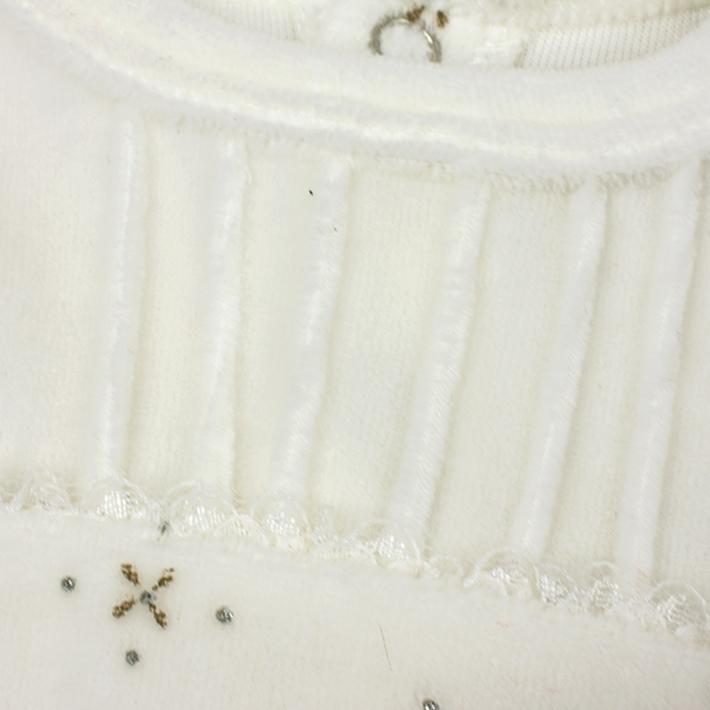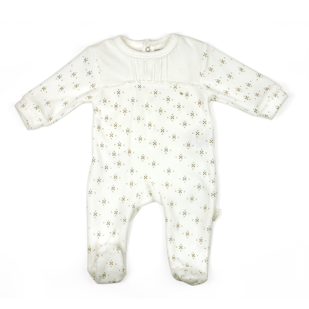 Велюровий зі стразами ніжно-молочний чоловічок Babybol для Вашої новонародженої дитини чудово підходить і для виписки, і для сну вдома. Манжети на рукавах, горловину прикрашає маленьке мереживо. Чоловічок застібається кнопками на спинці.