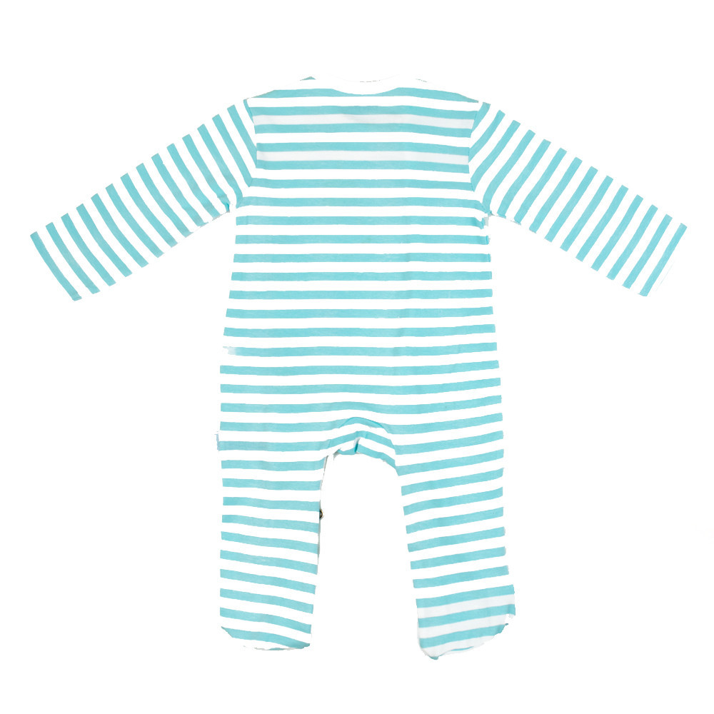 Трикотажний смугастий комбінезон-чоловічок Babybol застібається спереду на кнопки по всій довжині, що суттєво полегшує та прискорює процес одягання, кнопки між ніжками – для зручності зміни підгузка. Горловина та краї чоловічка оброблені трикотажною гумкою для запобігання розтягуванню під час прання. Половину комбінезону прикрашає веселий дитячий малюнок.