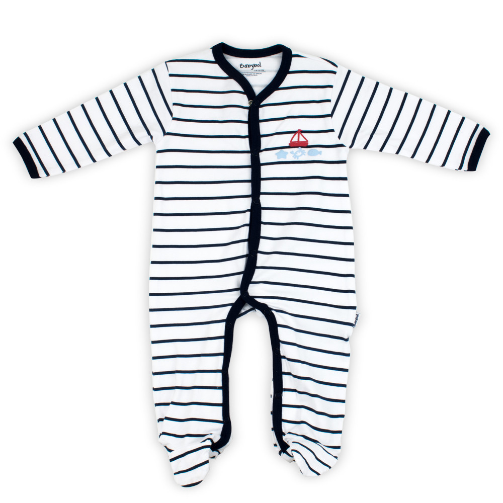 Трикотажний смугастий комбінезон-чоловічок Babybol для новонародженого застібається спереду на кнопки по всій довжині, що суттєво полегшує та прискорює процес одягання, кнопки між ніжками – для зручності зміни підгузка. Горловина, краї чоловічка, низ рукава оброблені контрастною трикотажною гумкою для запобігання розтягуванню. Чоловічок прикрашає весела морська тема – корабель, краби, кит, зірки.