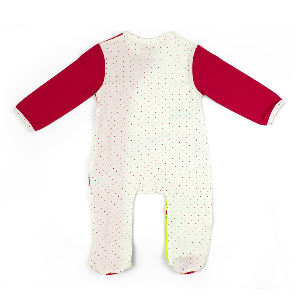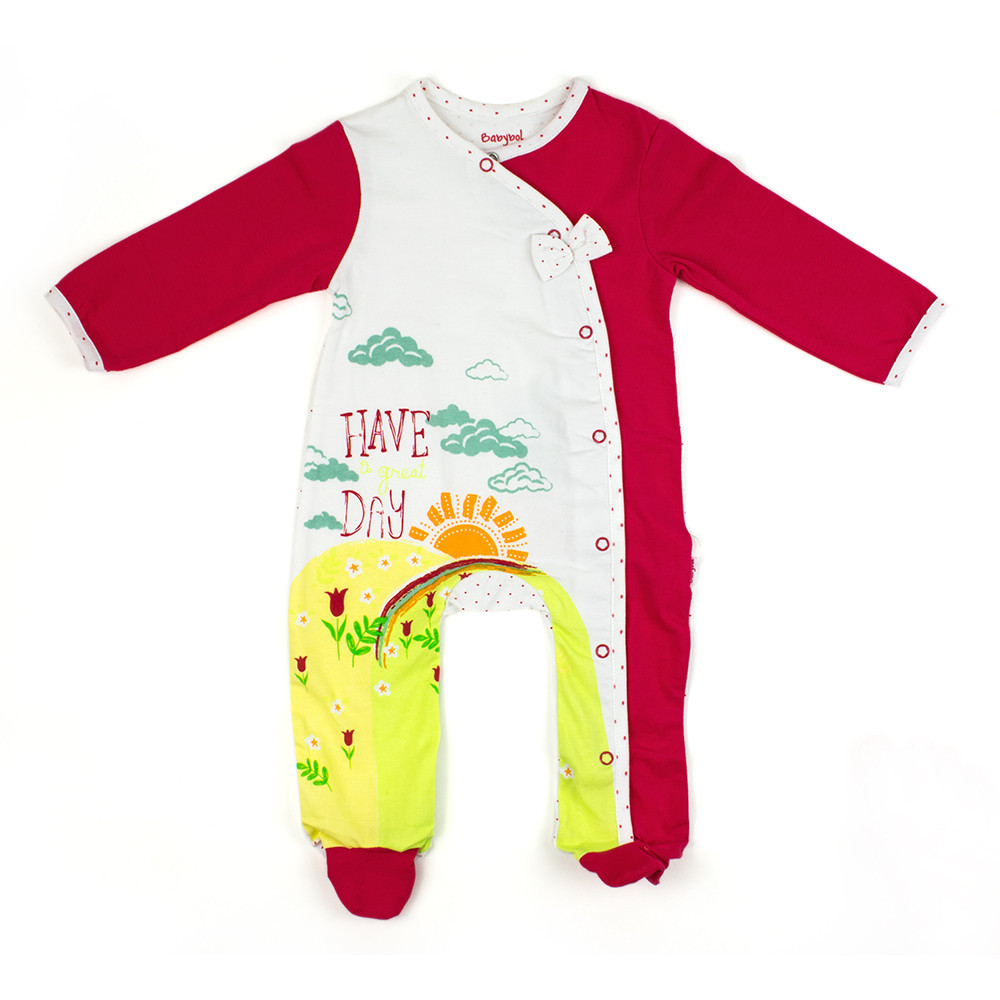 Чудова пропозиція новонародженій дівчинці трикотажний кольоровий комбінезон-чоловічок Babybol з бічною застібкою спереду на кнопки по всій довжині, що суттєво полегшує та прискорює процес одягання. Для запобігання розтягуванню горловина, краї низу, рукава оброблені трикотажною гумкою в дрібний горошок, малюнок, як на спинці. Комбінезон прикрашає веселий, сонячний малюнок.
