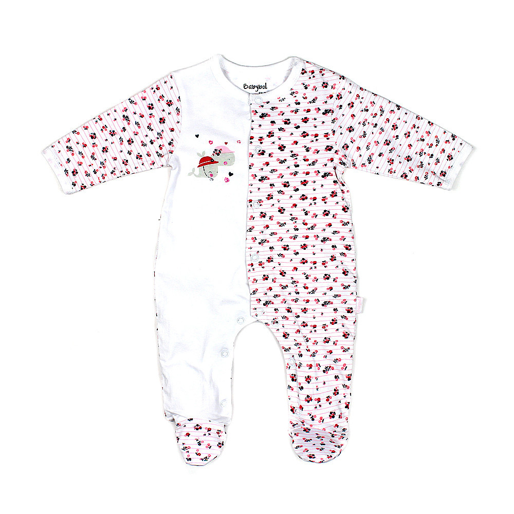 Чудова пропозиція новонародженій дівчинці трикотажний кольоровий комбінезон-чоловічок Babybol із застібкою спереду по центру на кнопки по всій довжині, а також між ніжками, що суттєво полегшує та прискорює процес одягання. Для запобігання розтягуванню горловина і рукава оброблені однотонною трикотажною гумкою. Комбінезон прикрашає веселий, сонячний малюнок.