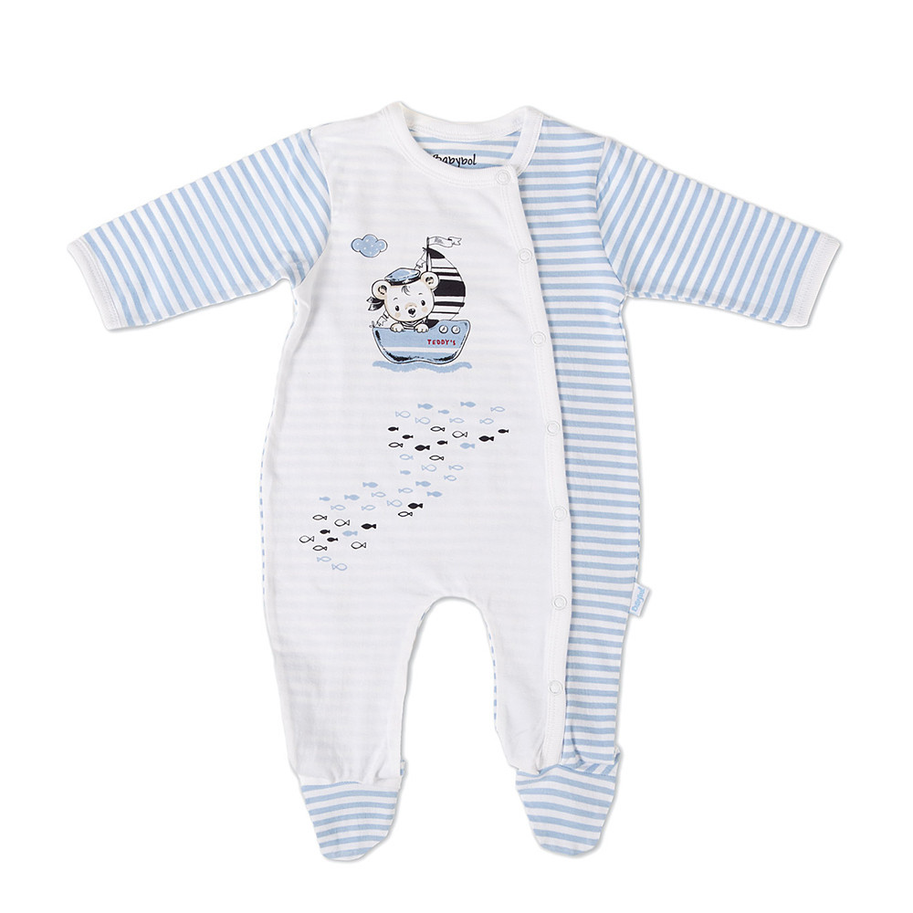 Чудова пропозиція для новонароджених діток - трикотажний комбінезон-чоловічок Babybol зі смугастими вставками та рукавами, з бічною застібкою спереду на кнопки по всій довжині, що суттєво полегшує та прискорює процес одягання. Однотонну половинку переду прикрашає принт на морську тематику. Для запобігання розтягуванню горловина і рукава оброблені однотонною трикотажною гумкою.