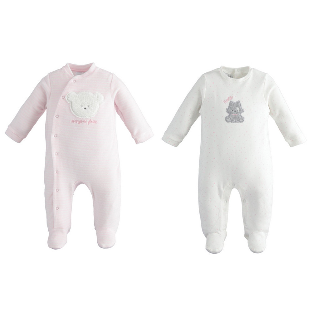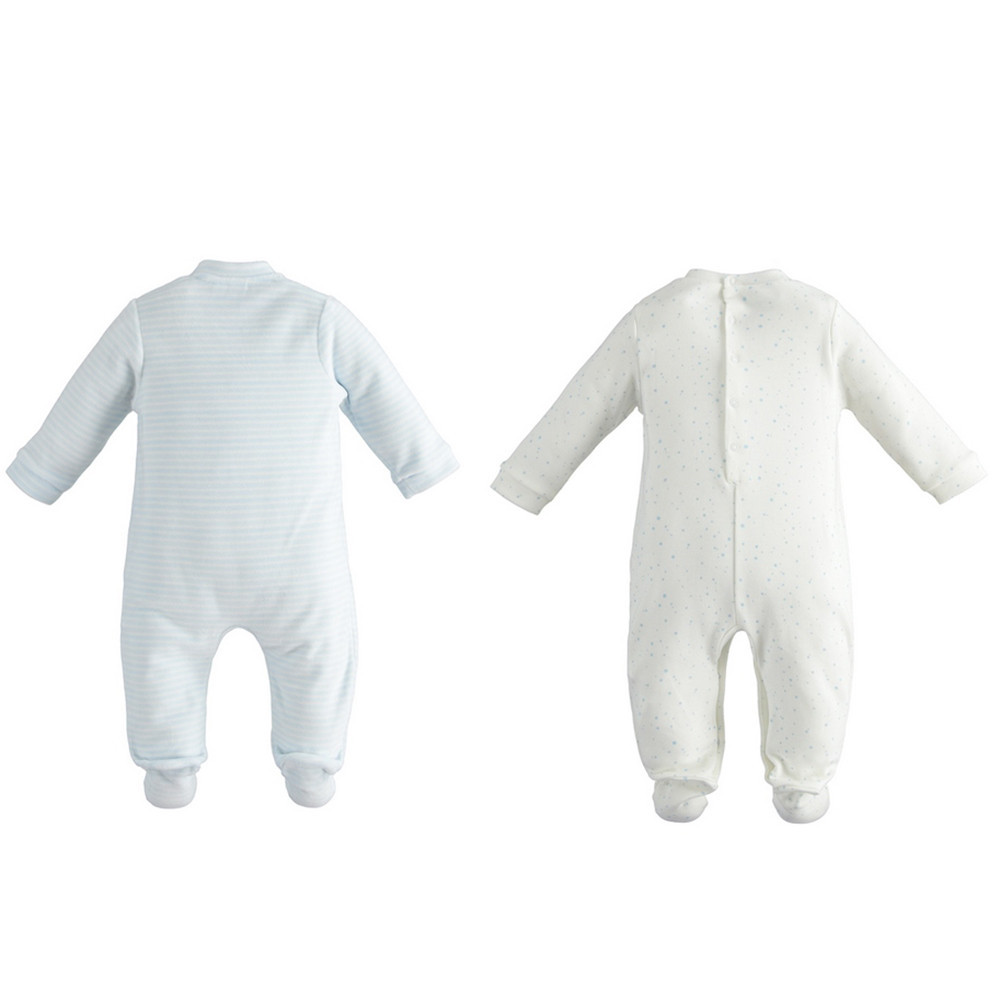 Комплект iDO складається з 2 комбінезонів для новонароджених, модель унісекс. Комплект складається з одного комбінезона з 100% бавовни з мікрочастинками в горошок і аплікацією ніжною маленької собачки спереду, зручно застібається ззаду і всередині штанини, а також комбінезон з 100% пофарбованої велюрової пряжі з застібкою прикритої планкою спереду і аплікацією плюшевого ведмедика, графікою і вишивкою ведмедя . Ідеально для подарунка новонародженому. Набір доступний кремово-блакитному і кремово-рожевому кольорах.
