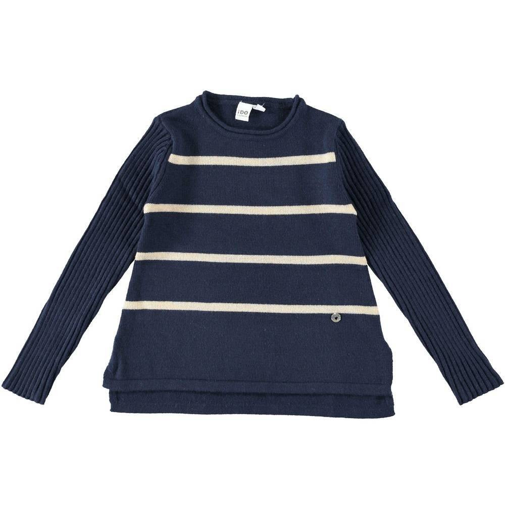 Трикотажний бавовняний трикотажний светр іDO прекрасне доповнення в гардеробі Вашої дівчинки. Светр злегка розкльошений до низу, з боків є невеликі розрізи, прикрашають контрастні смужки та рукави, пов'язані гумкою 2*2.