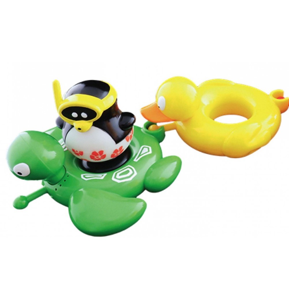 Яскраві друзі порадують малюка під час купання, з'єднуючись між собою один за одним і кружляючи навколо малюка. Плаваючи по воді, черепаха грає веселу мелодію. М'який пінгвін бризкається водою. Іграшка зроблена з безпечних для дітей матеріалів.