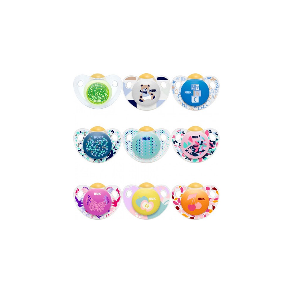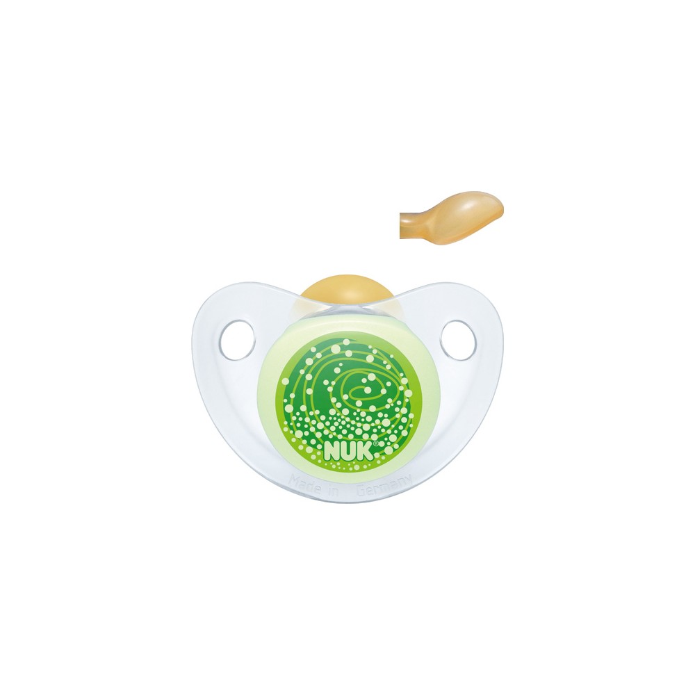 Ортодонтична латексна пустушка допоможе сформувати правильний прикус і забезпечить формування щелепно-лицьового апарату малюка. Вона має спеціальний утримувач у вигляді зручного гудзика. Клапанна система Nuk Air system дозволяє повітрю безперешкодно виходити через спеціальний отвір, зберігаючи соску еластичною і м'якою, добре тримає форму. Спеціальний циркуляційний канал виключить накопичення слини під загубником.