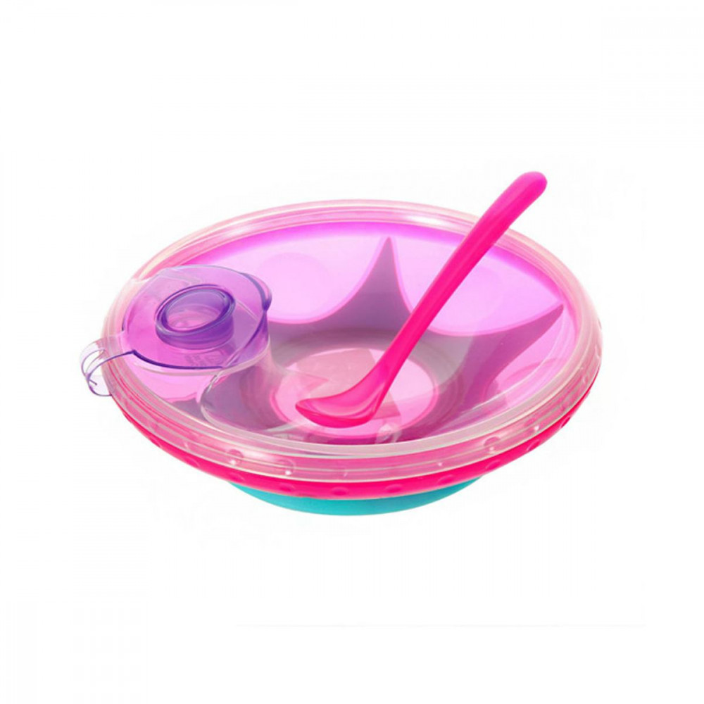 Тарілка має резервуар, який можна заповнити гарячою водою і зберегти їжу в тарілці теплою тривалий час. В основі - присоска, яка надійно утримує тарілку на місці і захищає від перекидання. У комплекті з тарілкою - ложка з довгою ручкою для зручного догодовування малюка мамою і зачерпивання їжі з дна тарілки.
