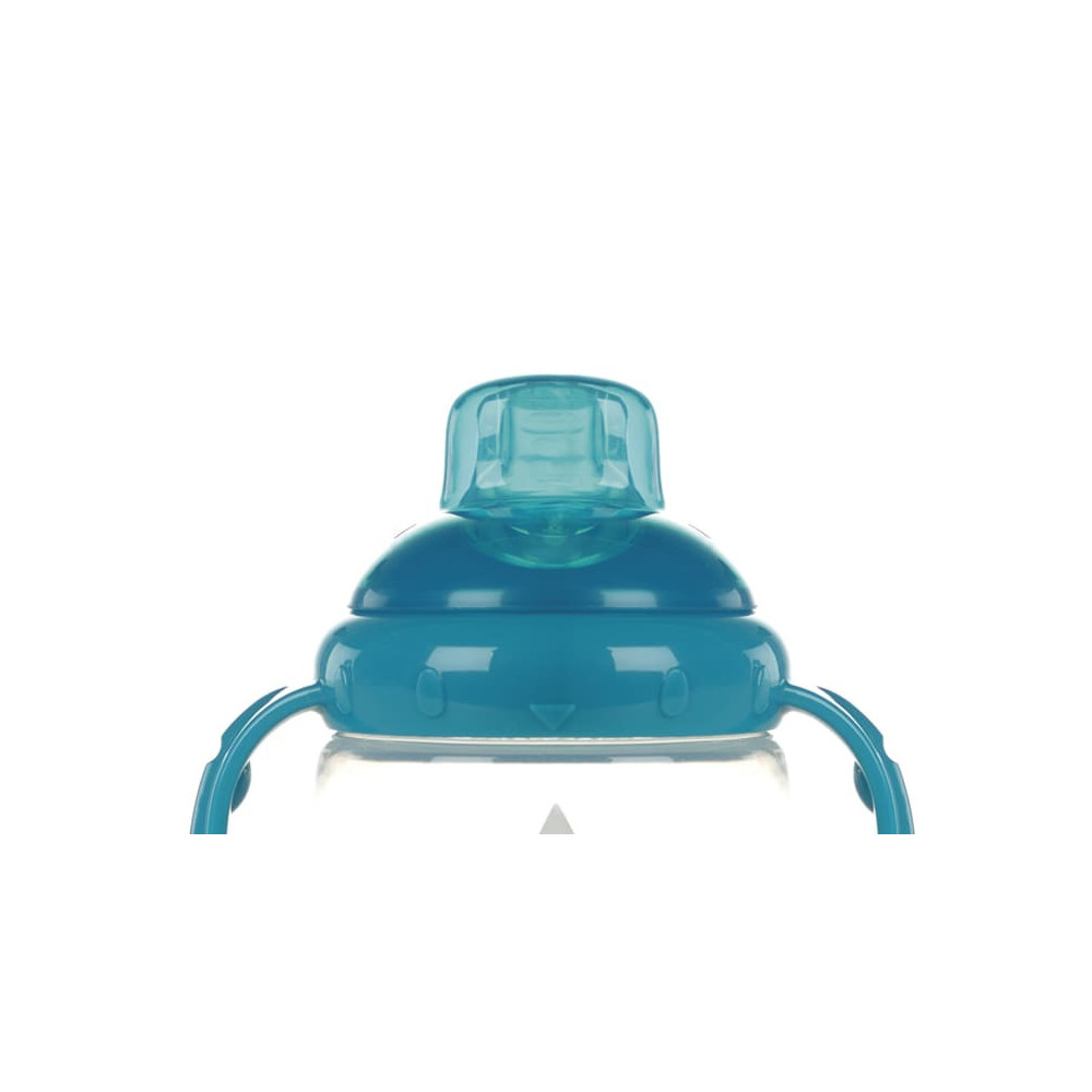 Чашка з клапаном, встановленим в носику, закривається, коли дитина перестає пити, запобігаючи проливання рідини.