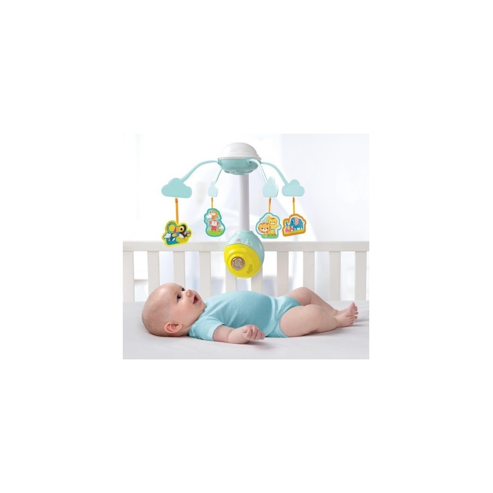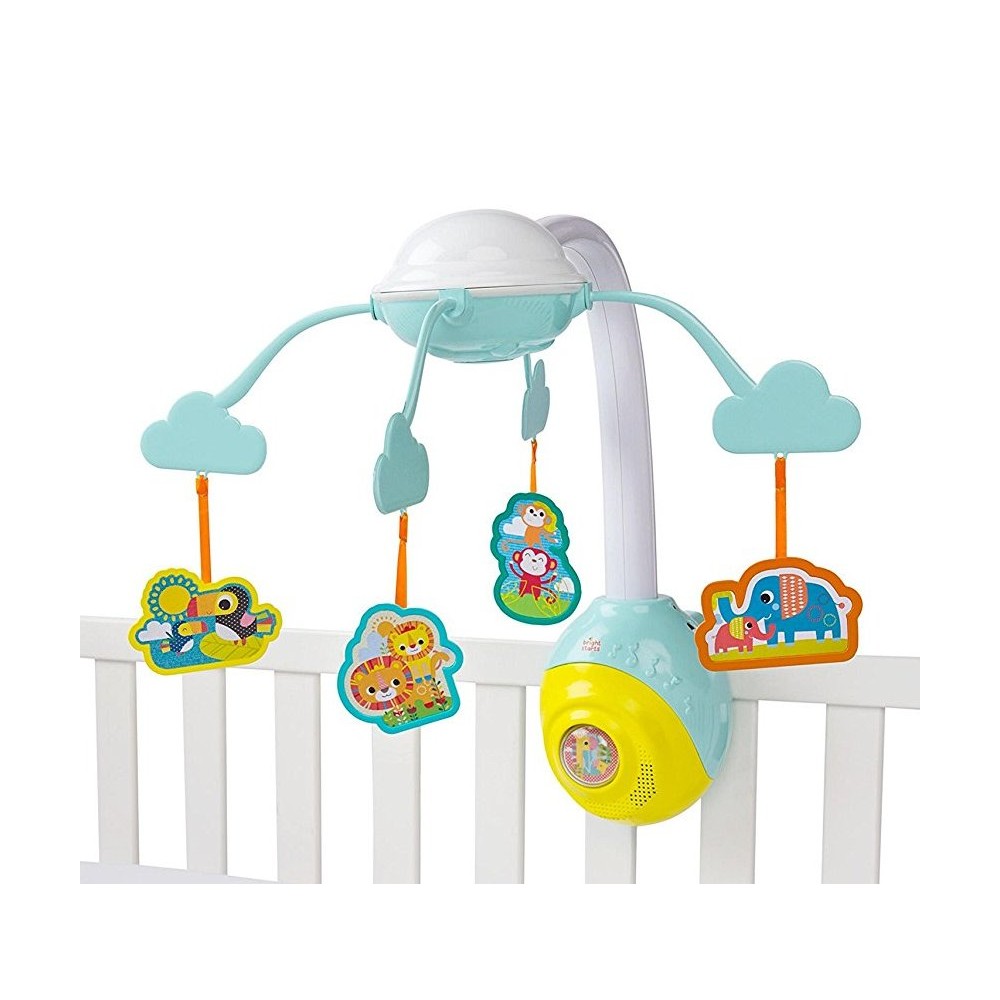 Мобіль на ліжечко Bright Starts Сон виконаний з яскравої пластмаси і легко кріпиться на дитячому ліжечку. Різнобарвні підвісні іграшки привертають увагу малюка, розглядаючи крутяться під музику іграшки.