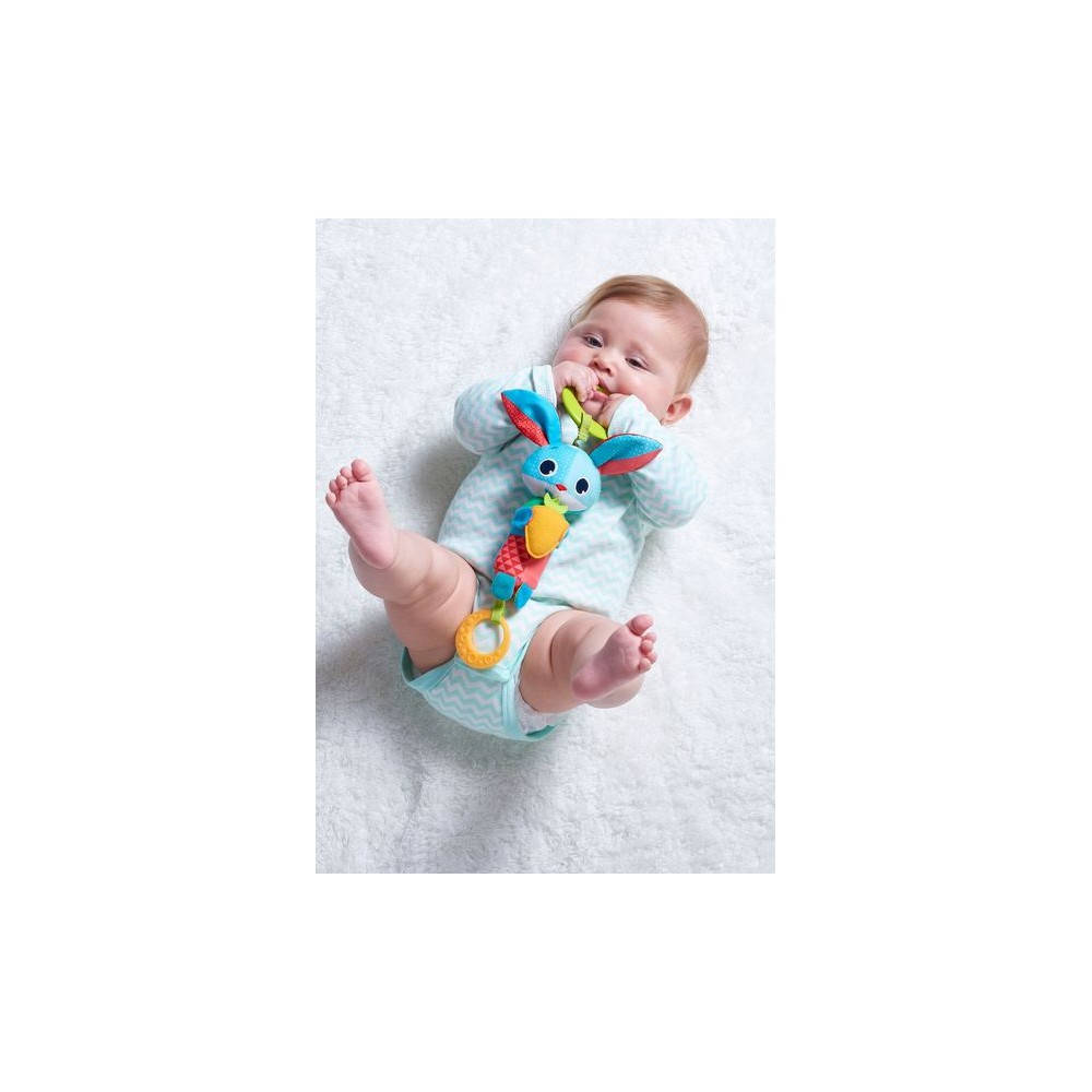 Підвіска Tiny Love Зайчик Томас — цей зайчик-дзвіночок сховав у собі приємний дзвін вітряного дзвіночка. Звук не ріже вухо, м'яко та ніжно заколисує діток.За допомогою такої іграшки малюк отримує перше уявлення про колір, мелодії, форму, матеріал. Розвиваються тактильні відчуття, в іграшці використовуються різні на дотик матеріали. Внизу зайчик заховав жовтогаряче колечко — його можна погризти та почухати об нього ясна, у такий спосіб полегшити період прорізування зубчиків.Забарвлення зайчика дуже приємне: м'які тони бірюзового, рожевого та жовтогарячого роблять цю іграшку неймовірно стильною.