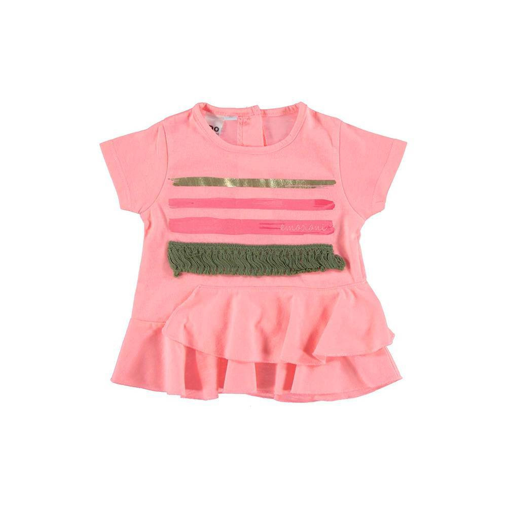 Оригінальна футболка з бавовняного трикотажу з круглою горловиною та пишним подолом та накладними воланом. Дуже симпатичний передній друк, прикрашений аплікаційним мереживом, застібається на спині на гудзики.