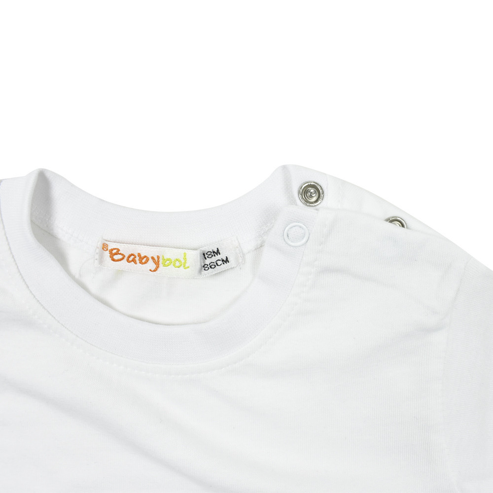 Чудова тонка трикотажна футболка Babybol виготовлена зі 100% бавовни. Застібка у вигляді кнопок на плечі для розмірів до 3 років, що спростить процес одягання. Горловина оброблена подвійною трикотажною гумкою, це запобігає розтягуванню трикотажу після прання.
